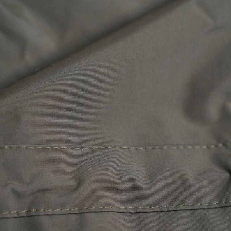 商品を平置きにして、股部分の合わせ(縫い目が十字に交差した部分)から裾までの長さをメジャーを生地に沿わせてはかっています。右足の股下をはかっています。