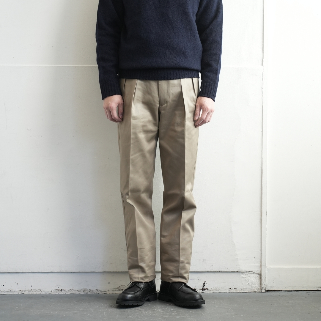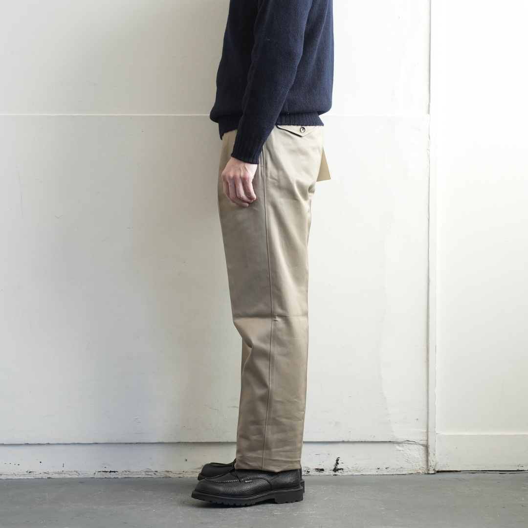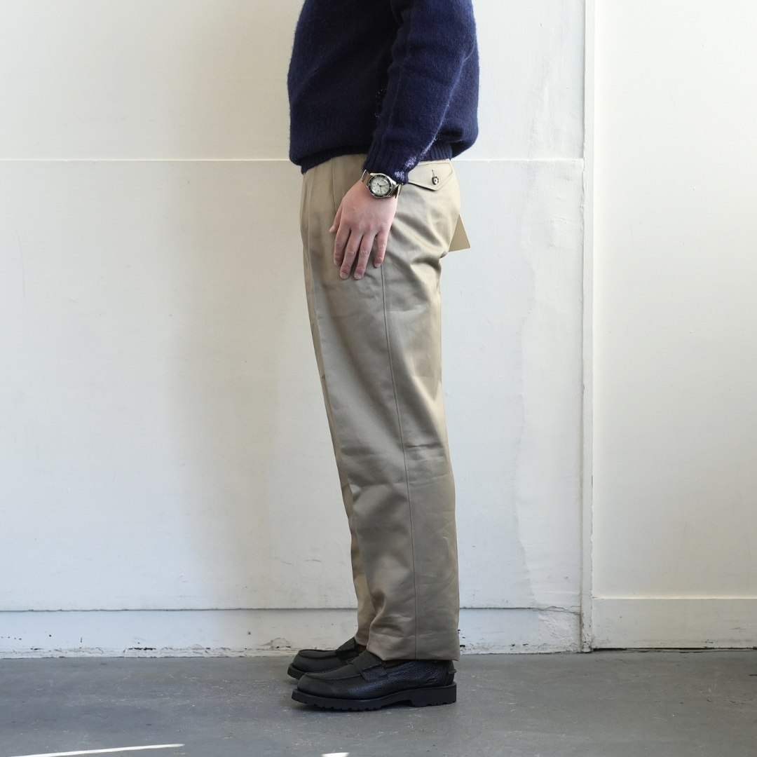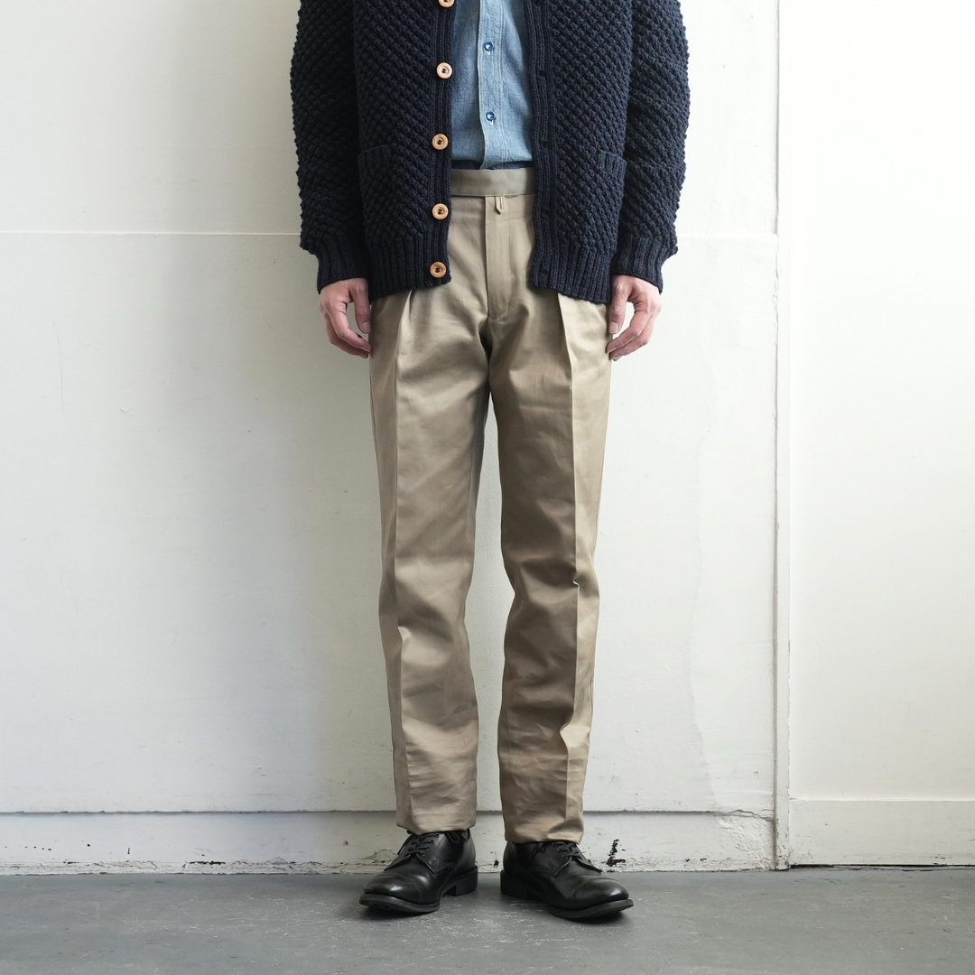 These trousers are a reissue of Douglas MacArthur's favorite trousers as the design source. The front has a classic design with two tucks and watch pockets, and a moderate tapered length.