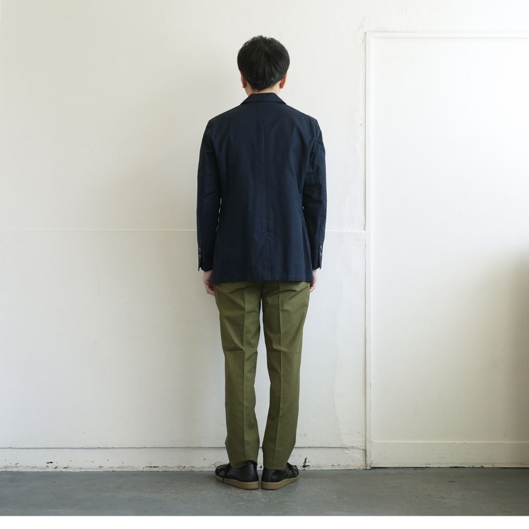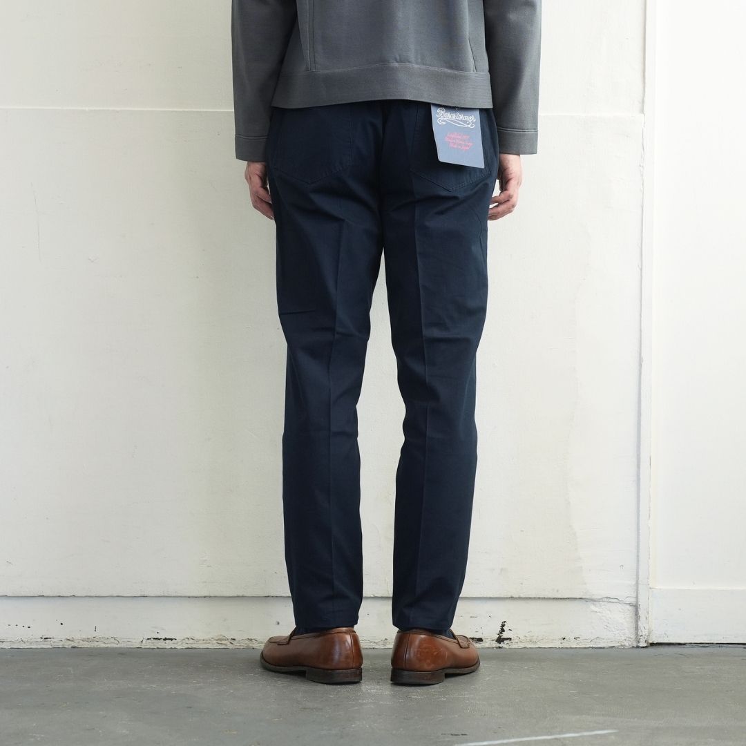 ベルトで腰位置を固定する。穿いた時のウエスト位置が変わると長さも変わってしまいます。ベルトで固定する事が大切です。