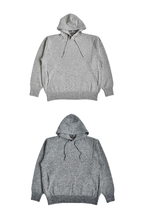 アンゴラを少し混ぜることにより、どこか紡毛のような雰囲気も含んだvintage感のある生地になります。カジュアルすぎず、綺麗すぎずど真ん中のニットパーカー。