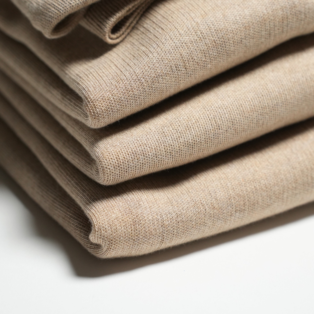 試作を繰り返し完成したオリジナル生地。素材、編み地、仕上げが相まって滑らかで弾力のあるモッチモチの手触りが特徴です。程よく目の詰まった編地で厚みはしっかりとしております。