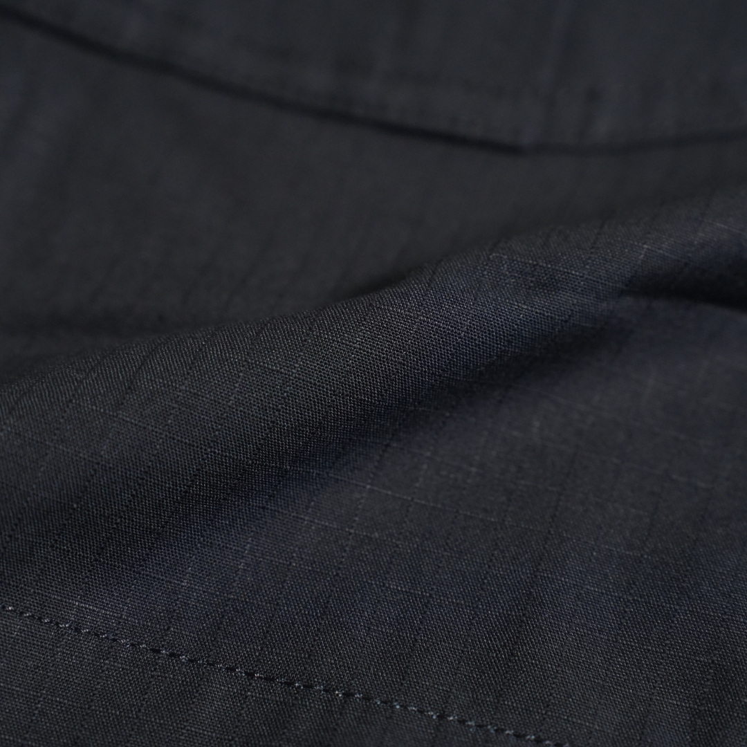 商品を平置きにして、股部分の合わせ(縫い目が十字に交差した部分)から裾までの長さをメジャーを生地に沿わせてはかっています。右足の股下をはかっています。