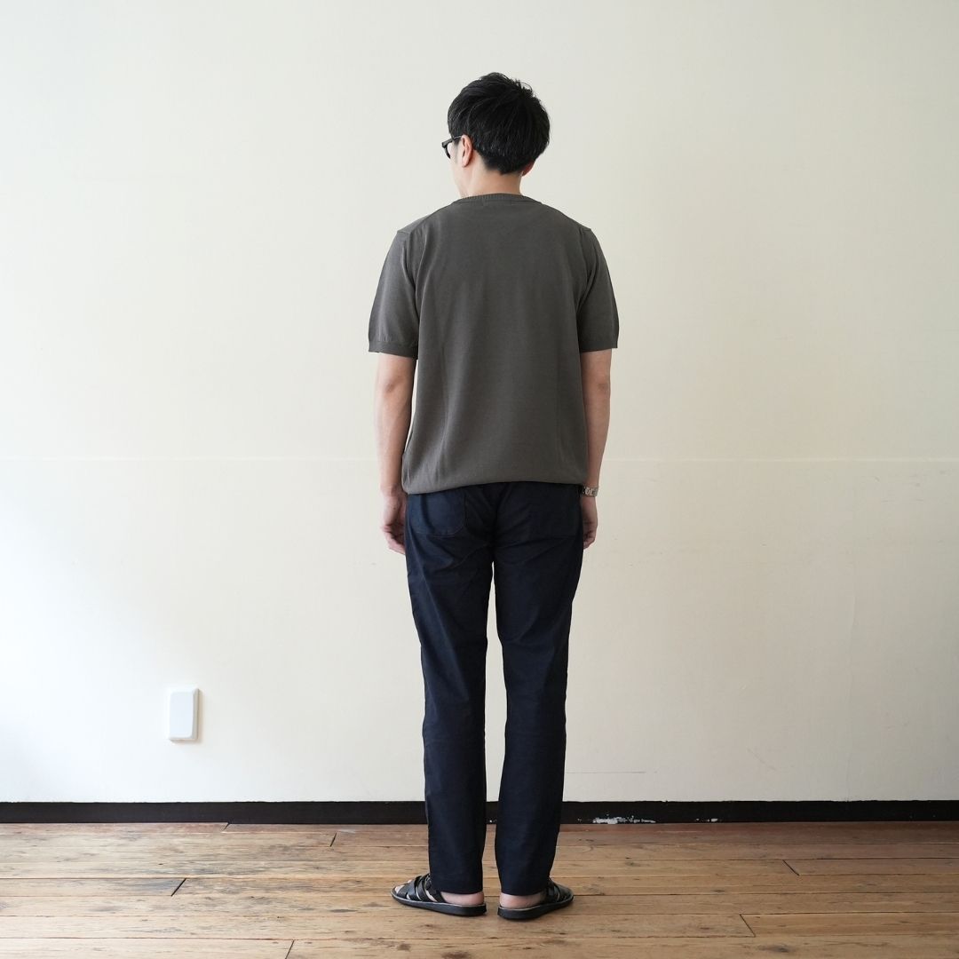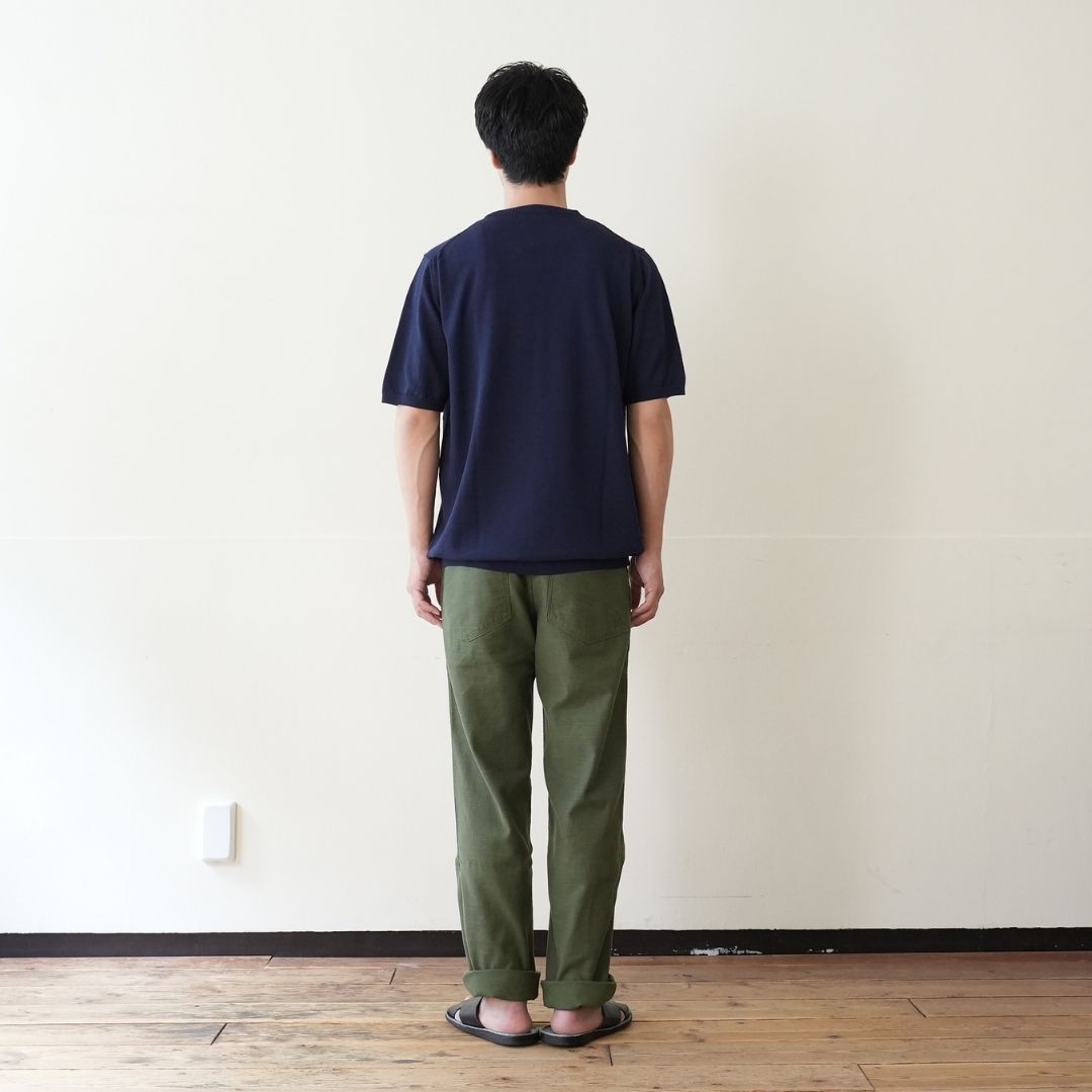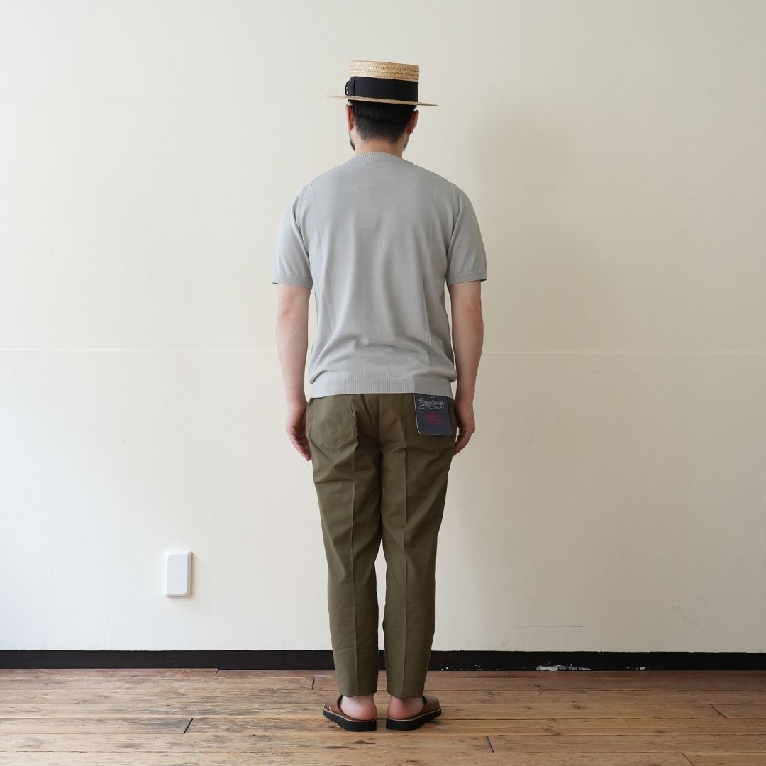 ベルトで腰位置を固定する。穿いた時のウエスト位置が変わると長さも変わってしまいます。ベルトで固定する事が大切です。