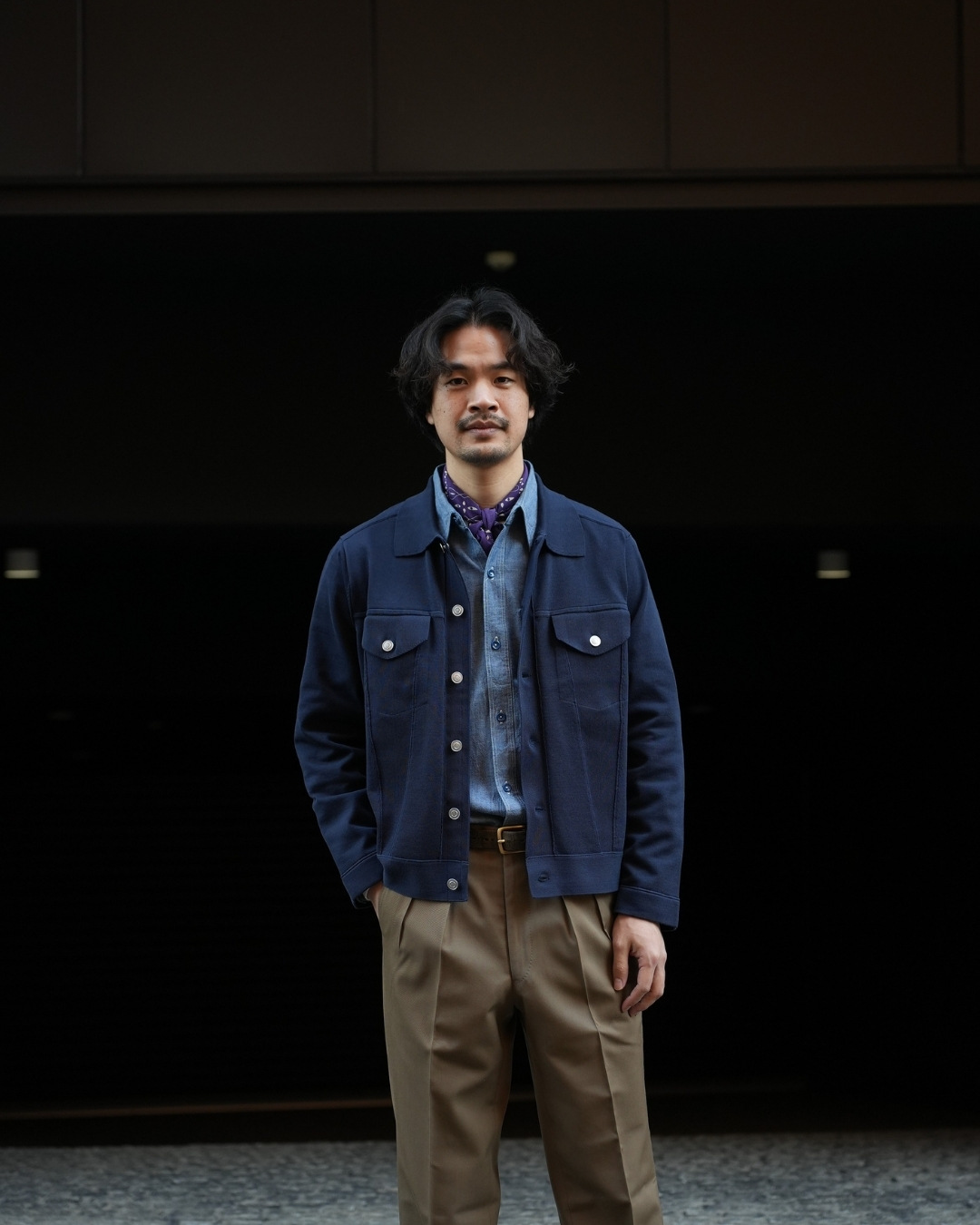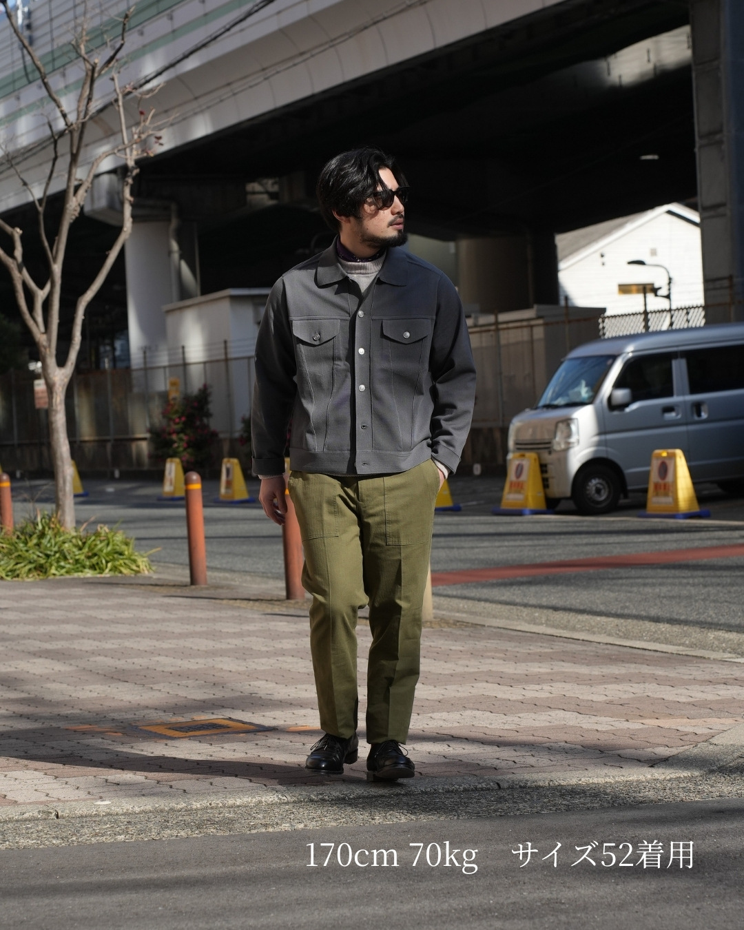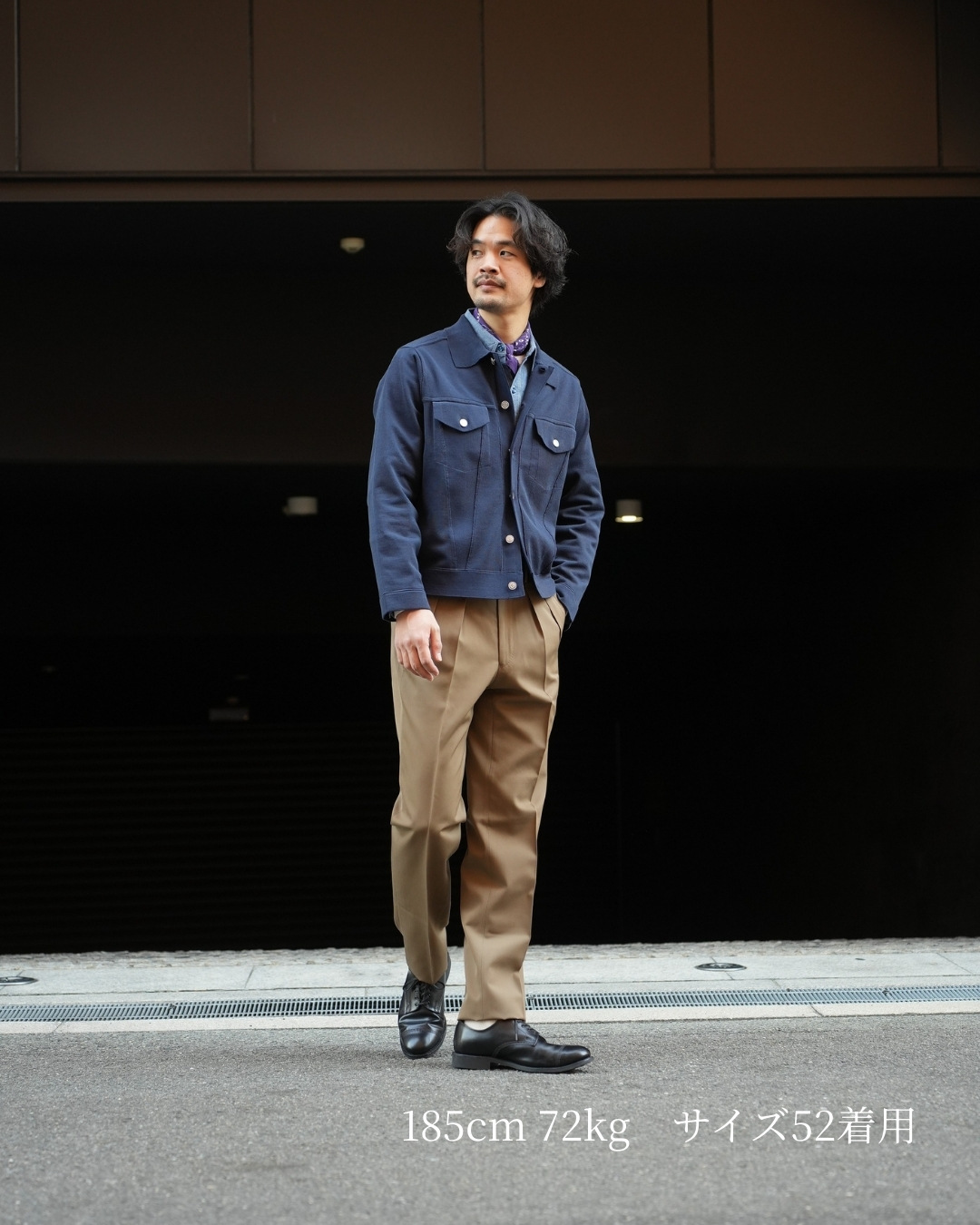 インナーにどれくらいの厚みを着るかで変わりますが、カットソーやシャツの上からならサイズ50が適正です。ゆとりを持たせるならサイズ52でも問題無いサイズ感です。