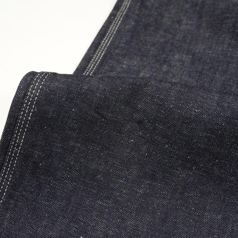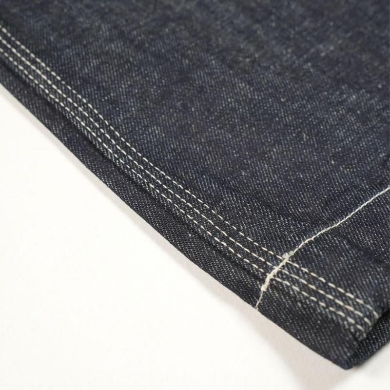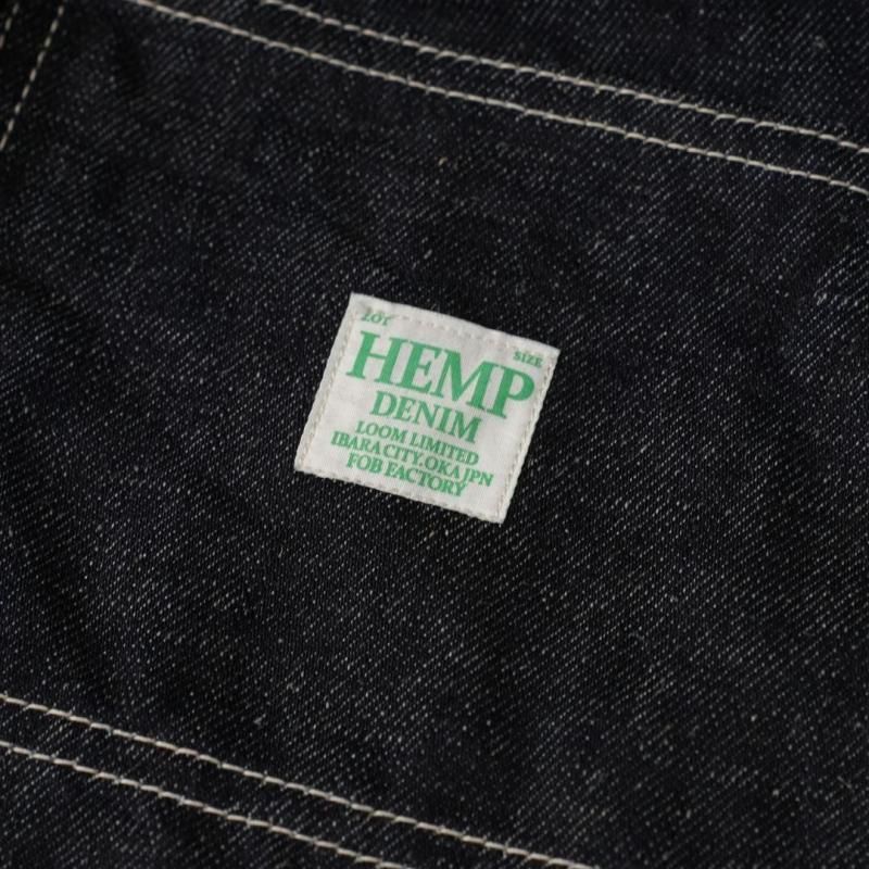 繊維の中でも最もサスティナブルと言われるヘンプを用いたデニム素材。ヘンプ特有のネップや毛羽立ち、光沢が同居するとても魅力的で雰囲気の良い生地感です。