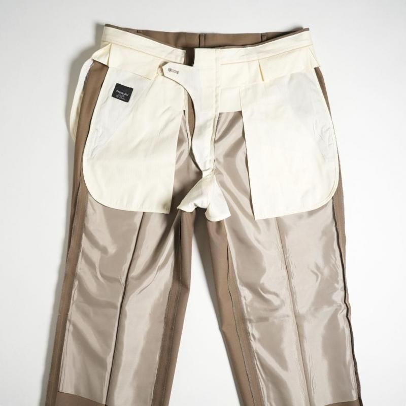 ベルトで腰位置を固定する。穿いた時のウエスト位置が変わると長さも変わってしまいます。ベルトで固定する事が大切です。