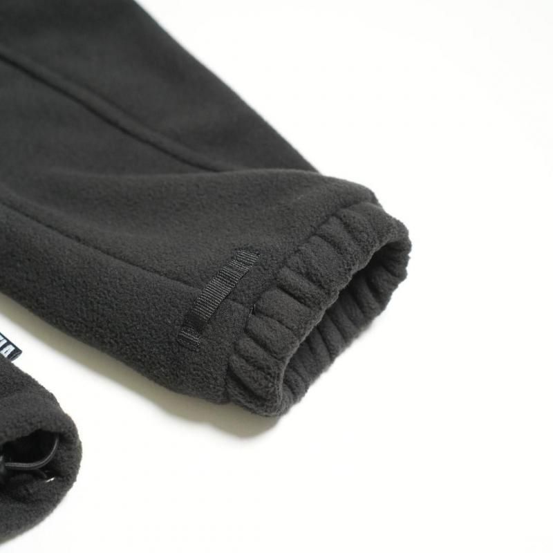 商品を平置きにして、股部分の合わせ(縫い目が十字に交差した部分)から裾までの長さをメジャーを生地に沿わせてはかっています。右足の股下をはかっています。
