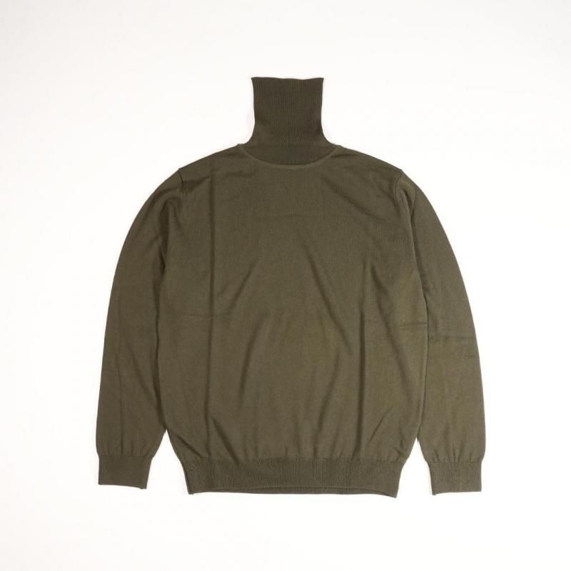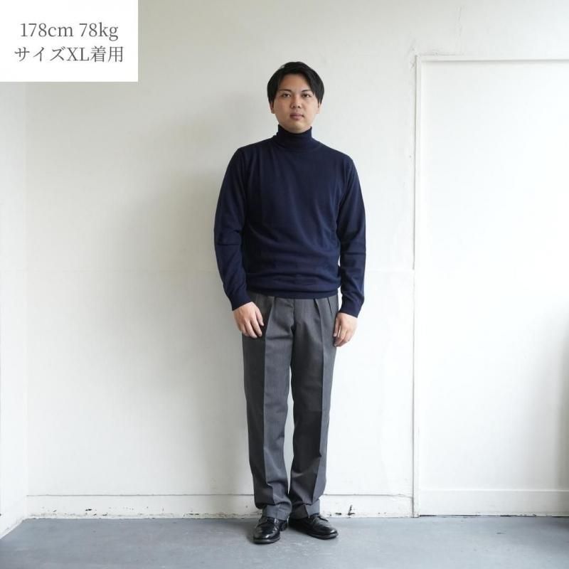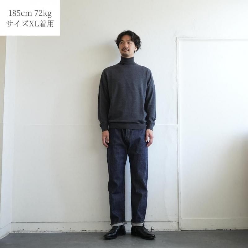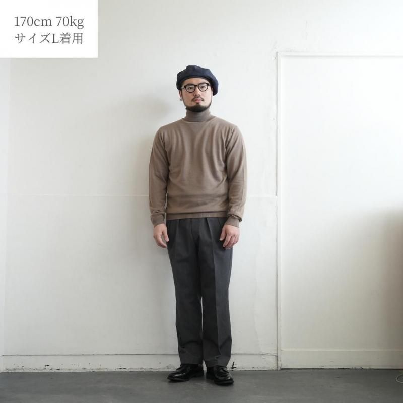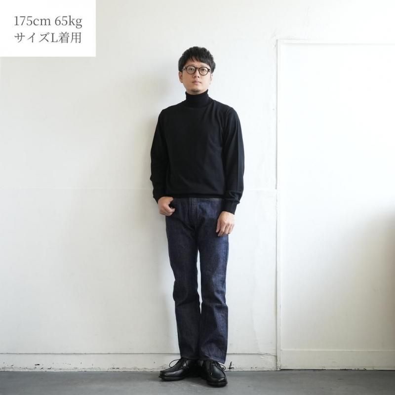 形はベーシックなタートルネック。クルーネックと同様に腕回りと腰回りは適度にスッキリさせジャケットやアウターとの重ね着がしやすいバランスにしており、袖と裾はリブ仕様でおさまりよく。着る人や着用シーンを想定し、完成されたサイズバランスは日本人体型によく合います。