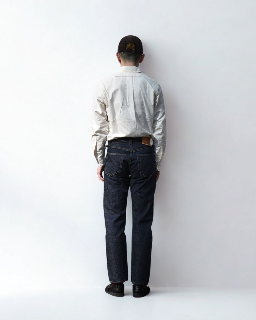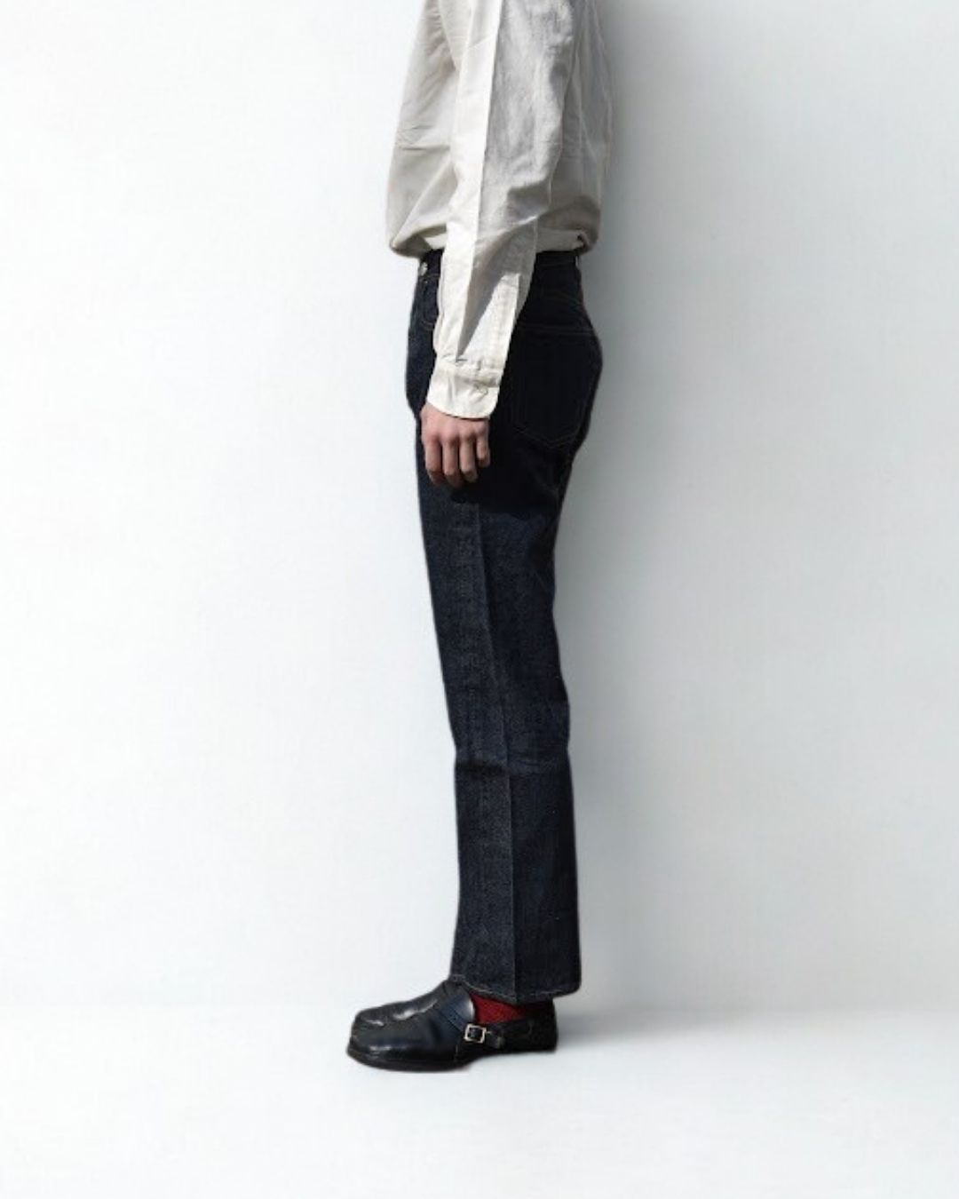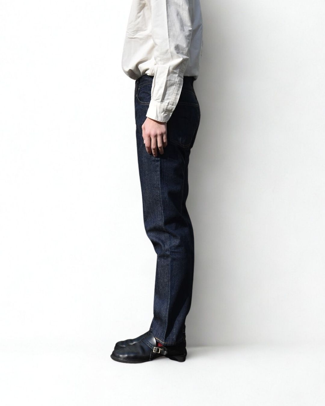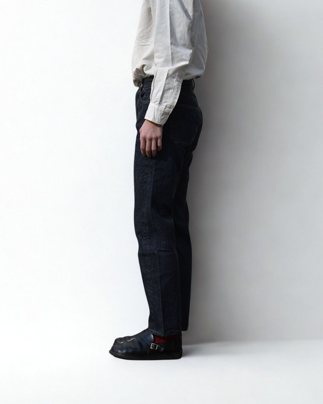 ベルトで腰位置を固定する。穿いた時のウエスト位置が変わると長さも変わってしまいます。ベルトで固定する事が大切です。