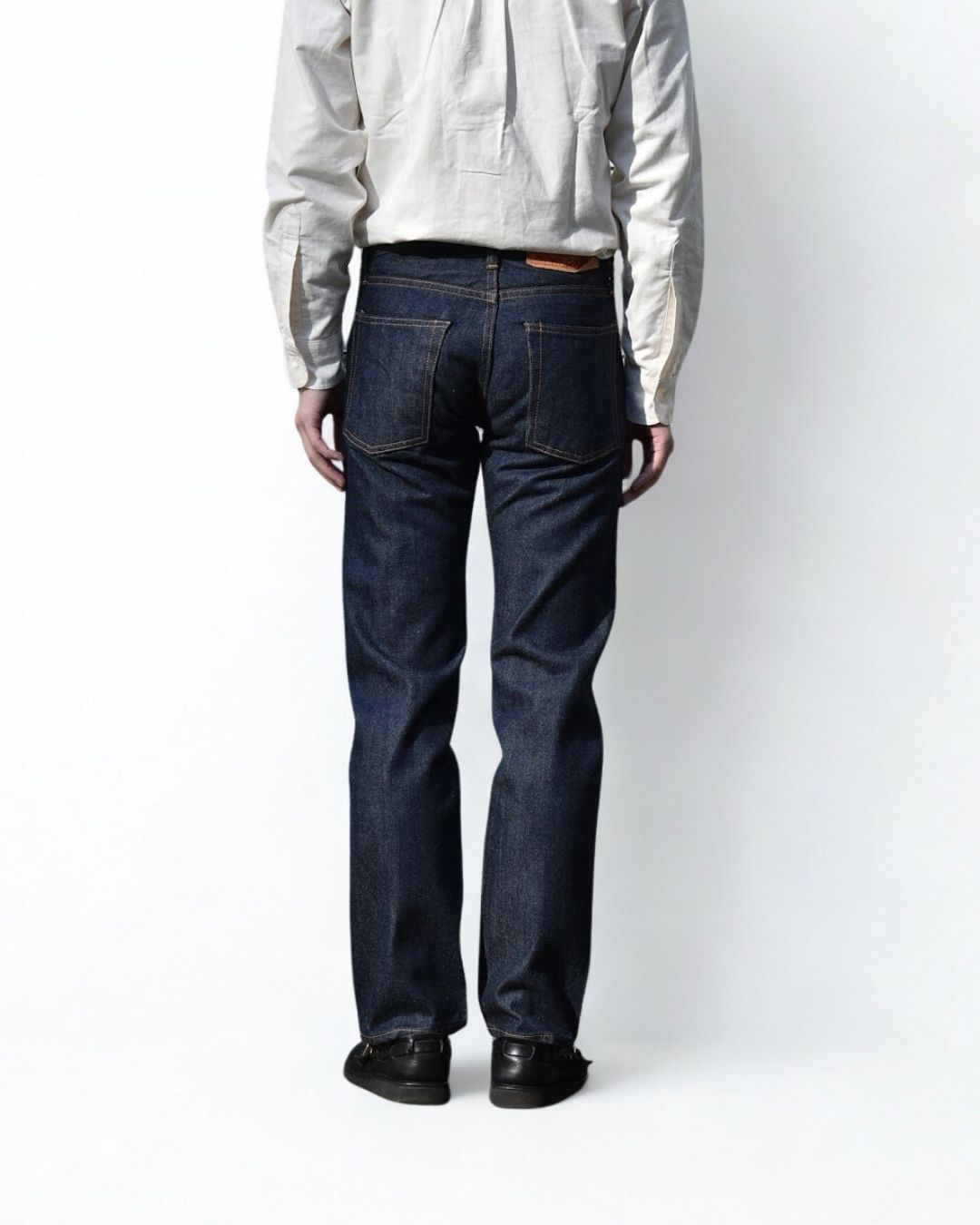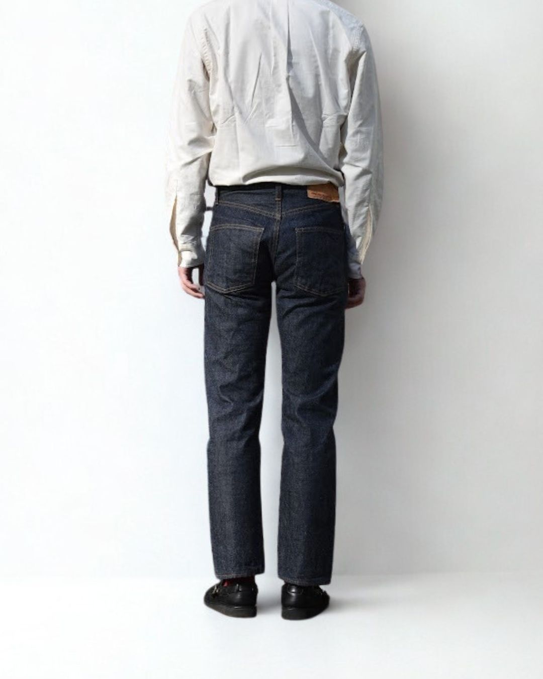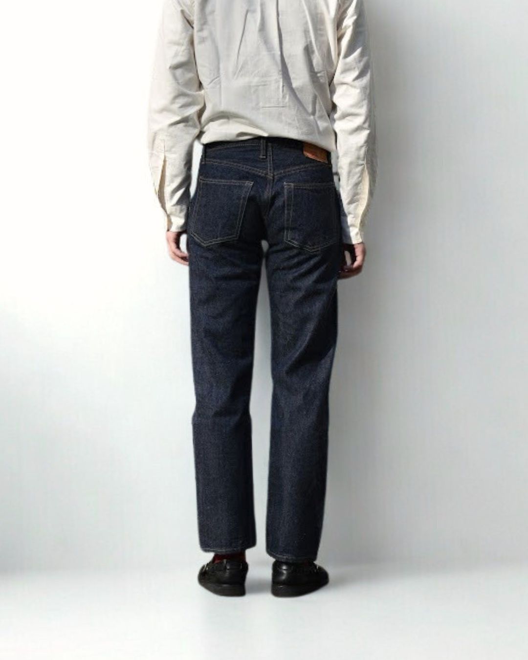 ベルトで腰位置を固定する。穿いた時のウエスト位置が変わると長さも変わってしまいます。ベルトで固定する事が大切です。