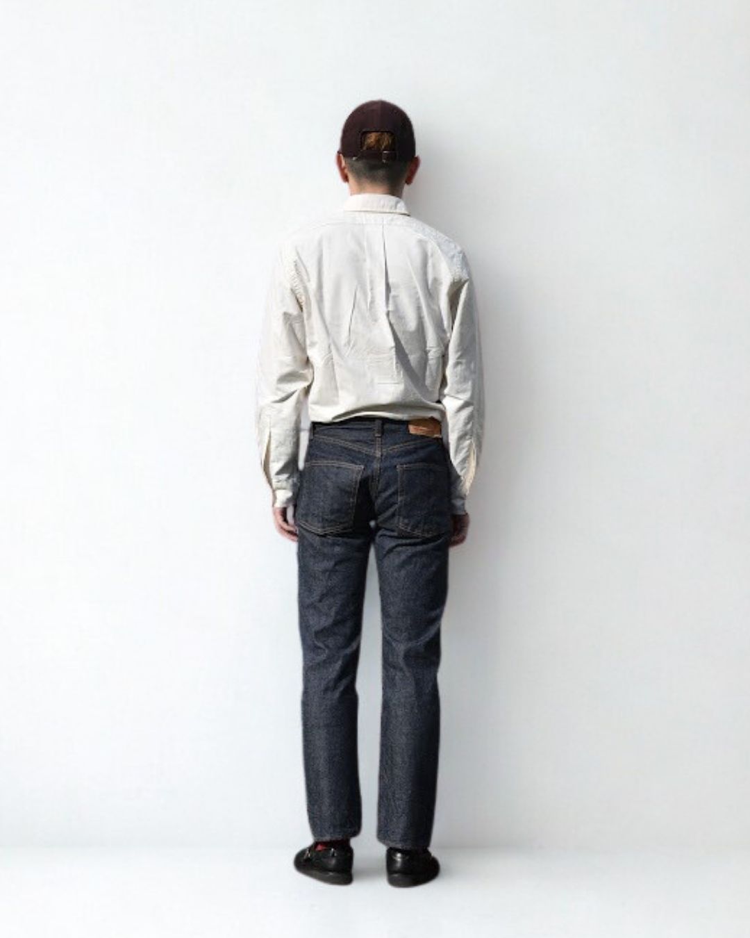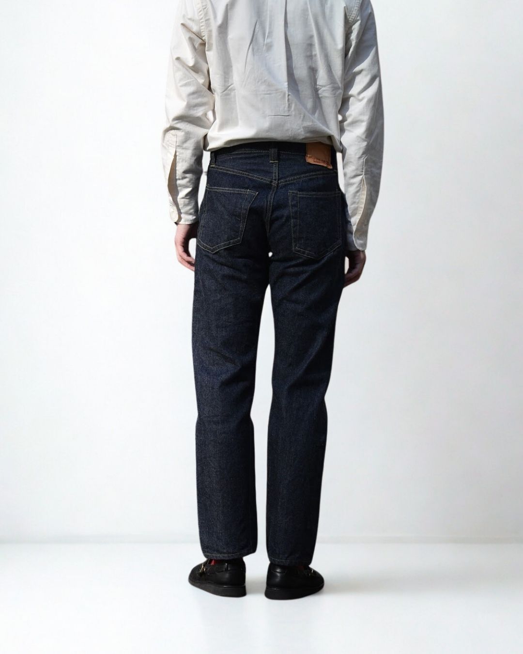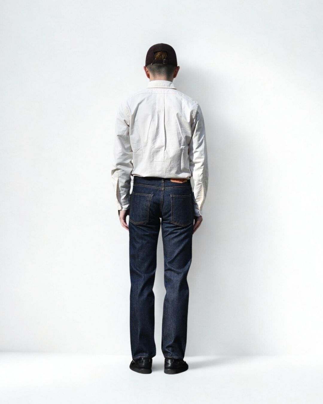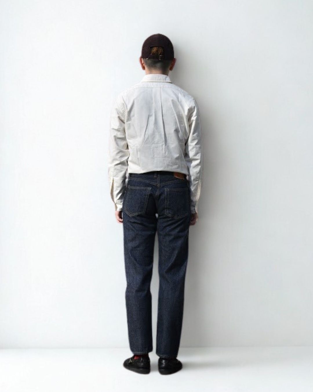 ベルトで腰位置を固定する。穿いた時のウエスト位置が変わると長さも変わってしまいます。ベルトで固定する事が大切です。