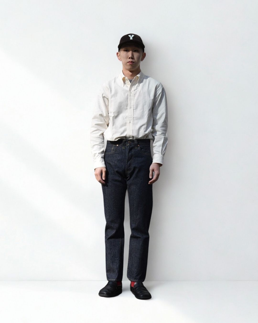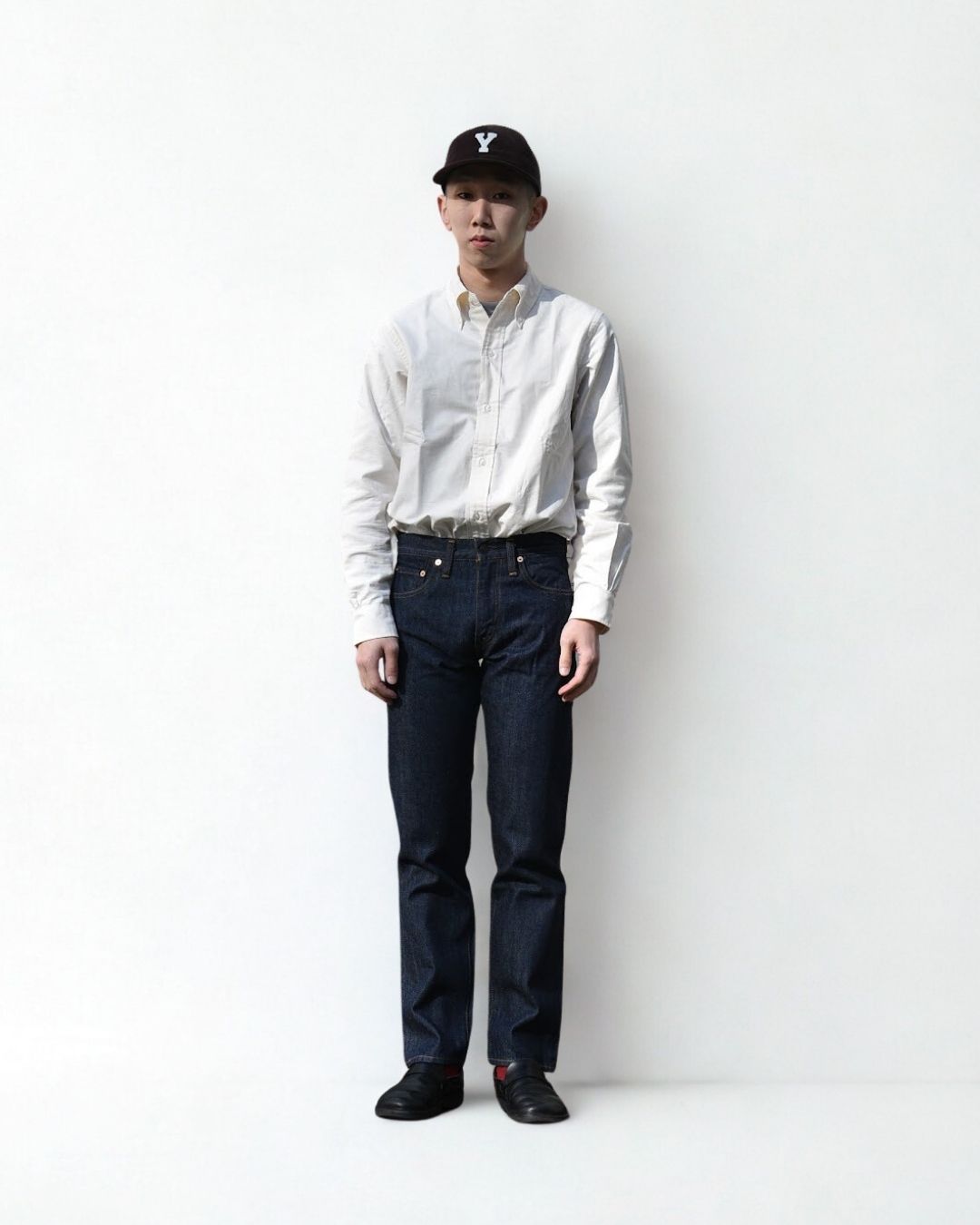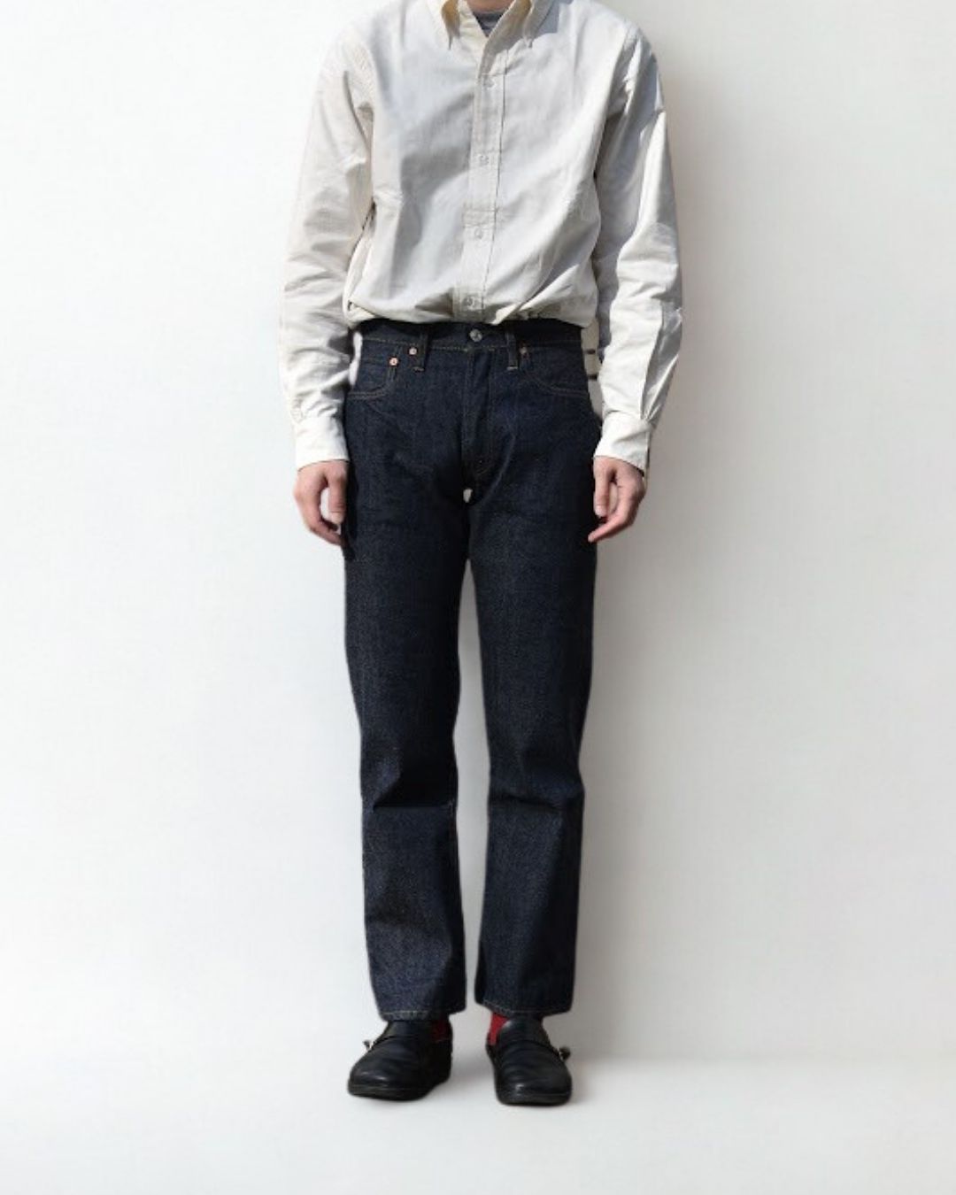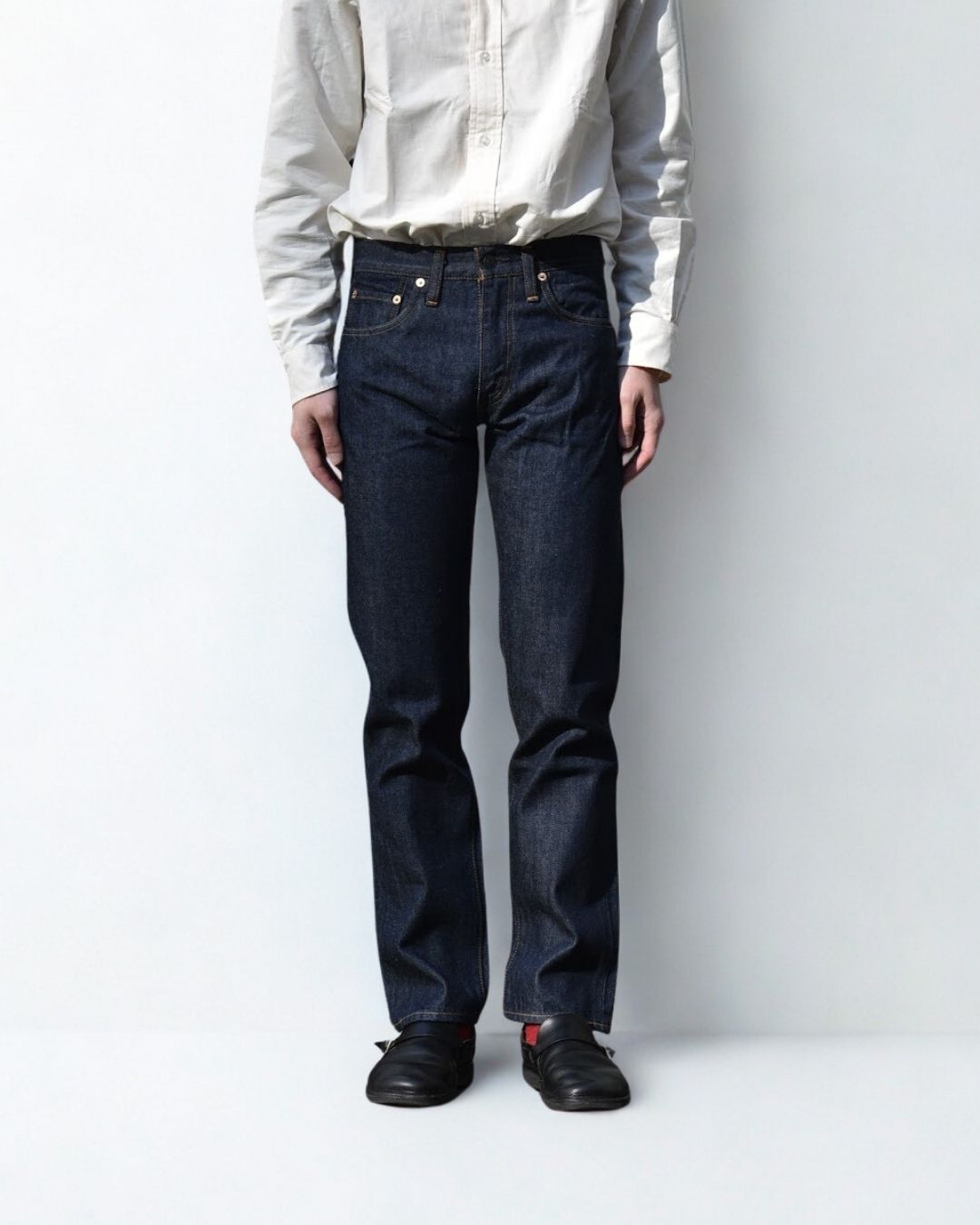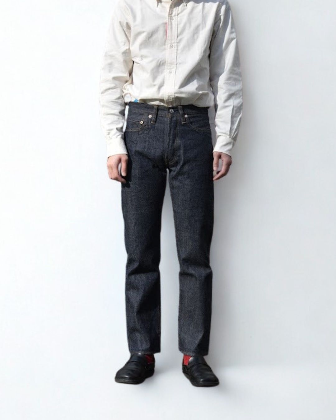 靴を履いて長さを決める。素足の状態で長さを合わせると靴を履いた時長さの見え方が異なります。合わせる靴を履いて長さを決めてください。