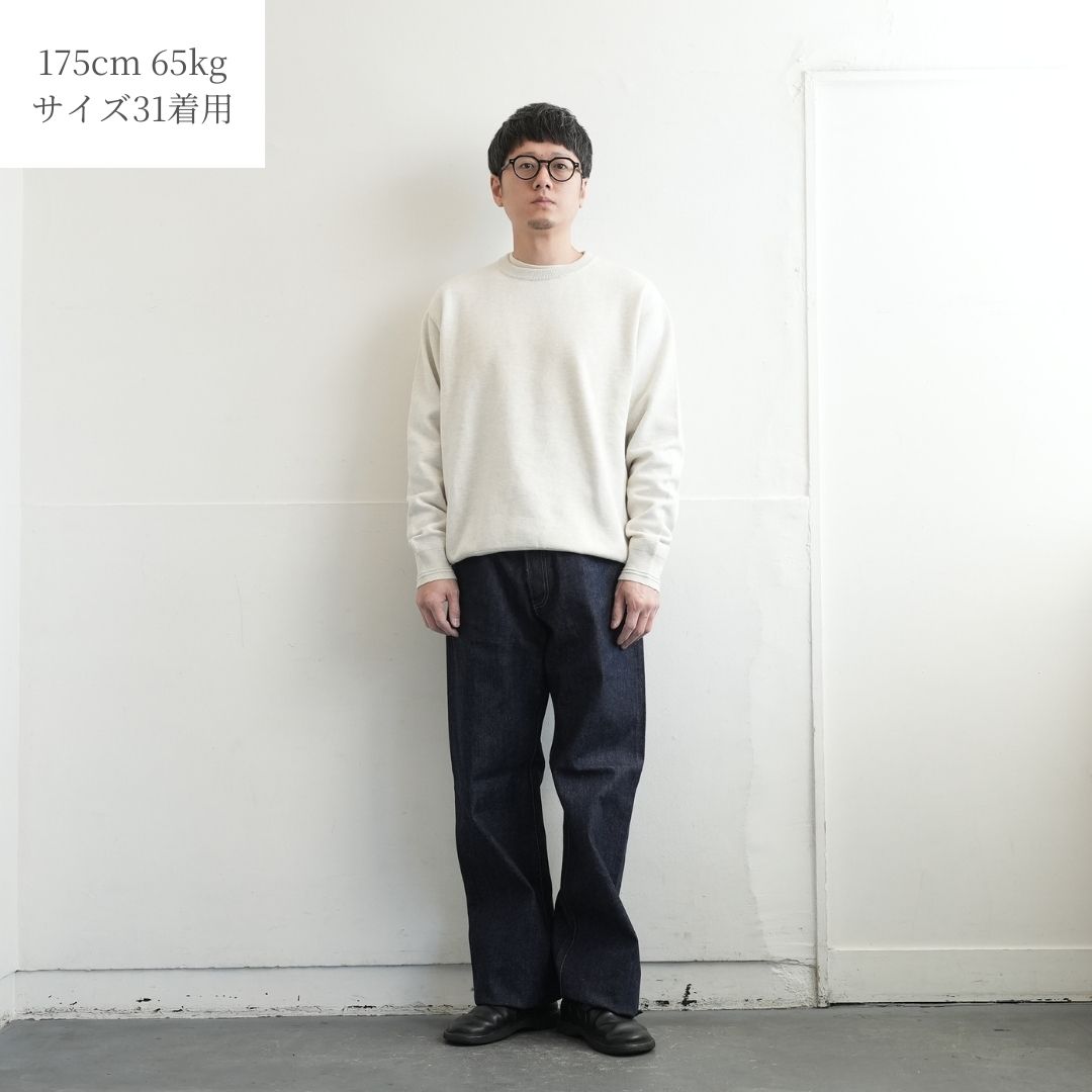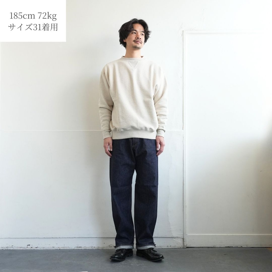 W34がジャストサイズです。かなりゆとりのある作りですのでW36に上げてベルトをして太く穿くスタイルも試してみたくなる武骨なシルエットです