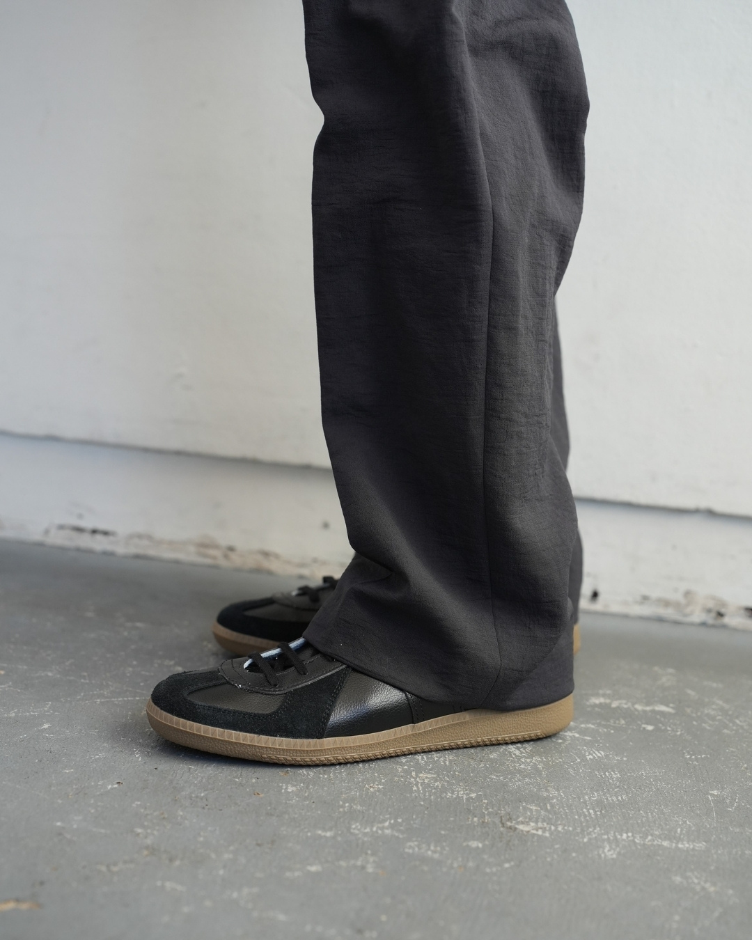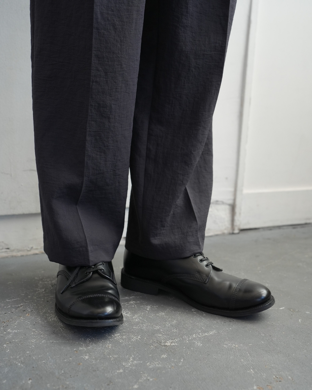 靴を履いて長さを決める。素足の状態で長さを合わせると靴を履いた時長さの見え方が異なります。合わせる靴を履いて長さを決めてください。