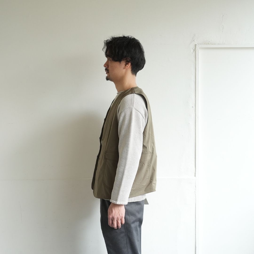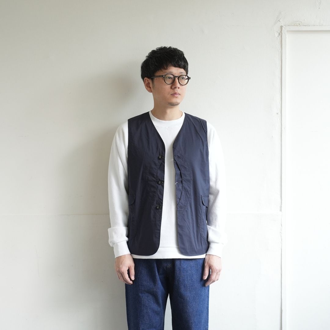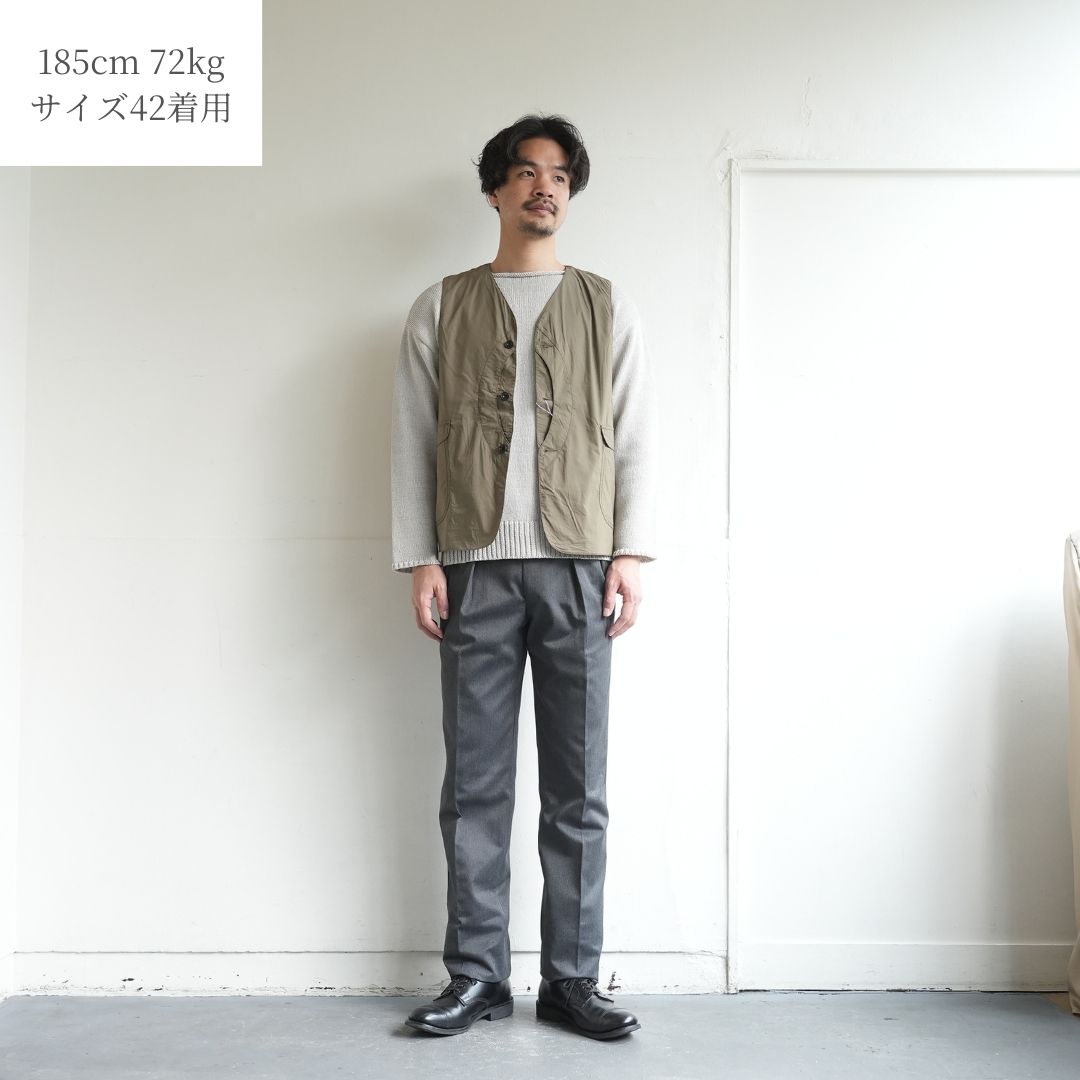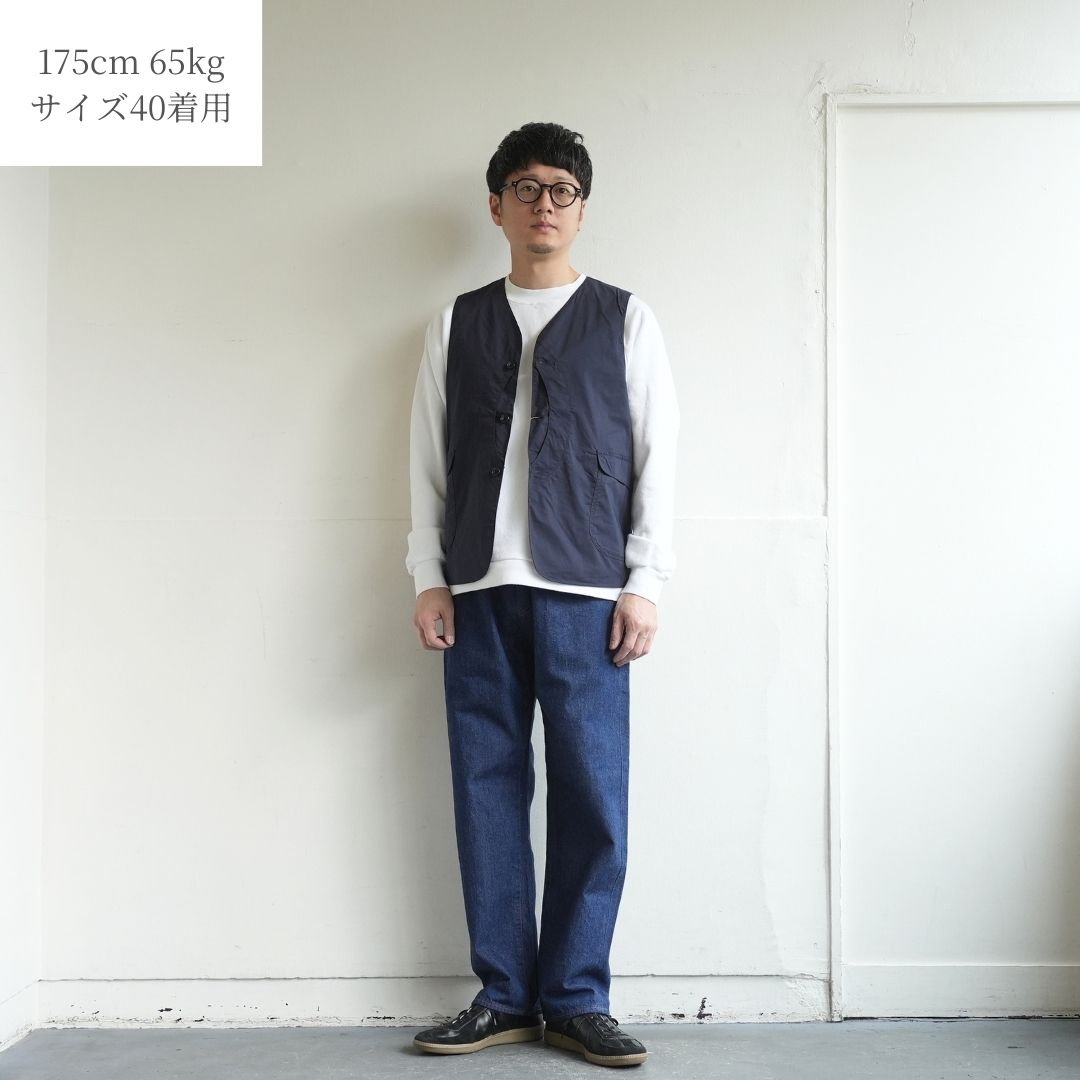 一方で、シルエットはしっかりとモダナイズされてあります。アームホールと身幅はややゆとりを持たせ、丈感は重ね着しやすいバランスに整えられています。シャツの上からはもちろん、薄手のニットにも無理なく重ねられる設計で、レイヤードの幅を広げてくれる存在です。古着のような野暮ったさはなく、あくまで普段のコーディネートで着られる仕上がりになっています。