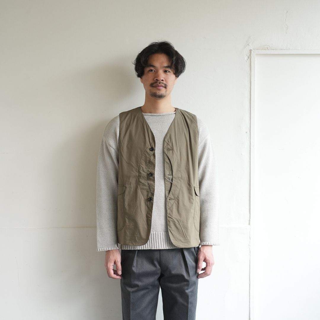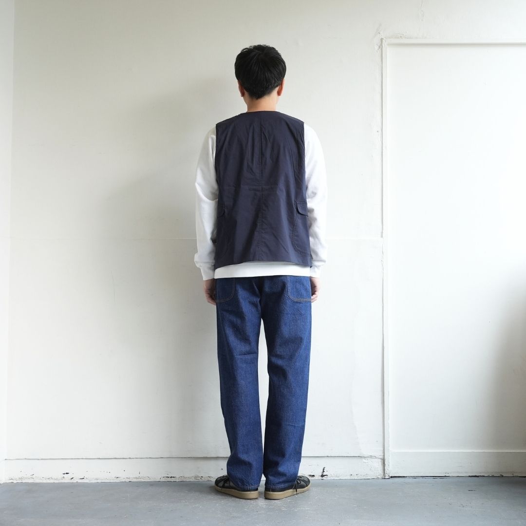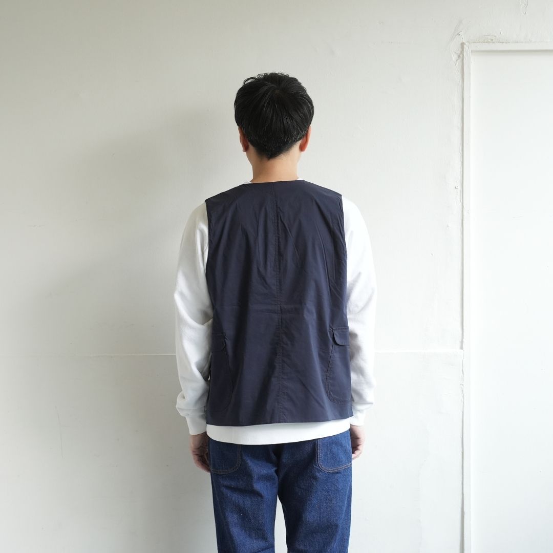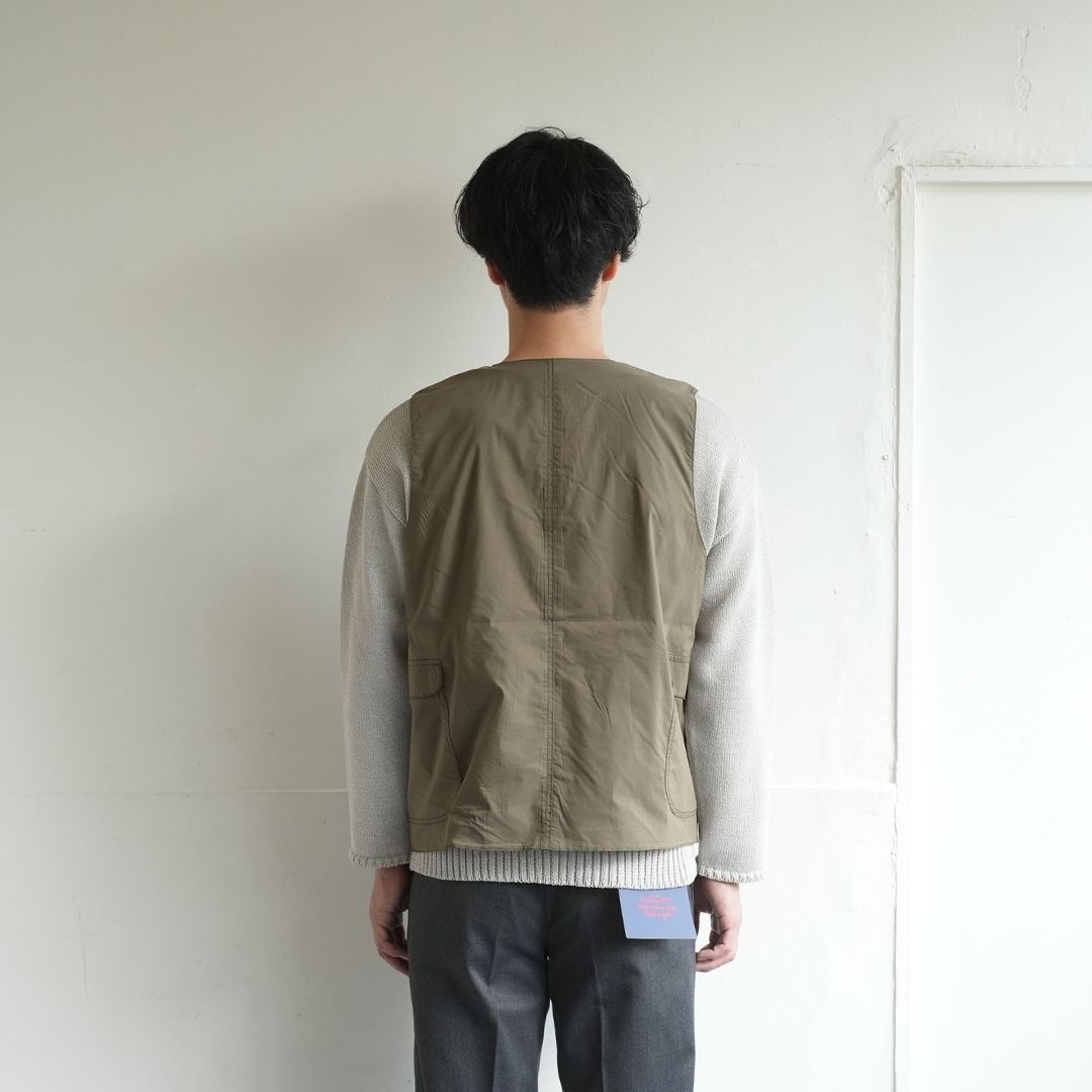 一方で、シルエットはしっかりとモダナイズされてあります。アームホールと身幅はややゆとりを持たせ、丈感は重ね着しやすいバランスに整えられています。シャツの上からはもちろん、薄手のニットにも無理なく重ねられる設計で、レイヤードの幅を広げてくれる存在です。古着のような野暮ったさはなく、あくまで普段のコーディネートで着られる仕上がりになっています。