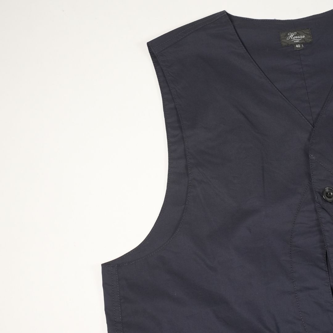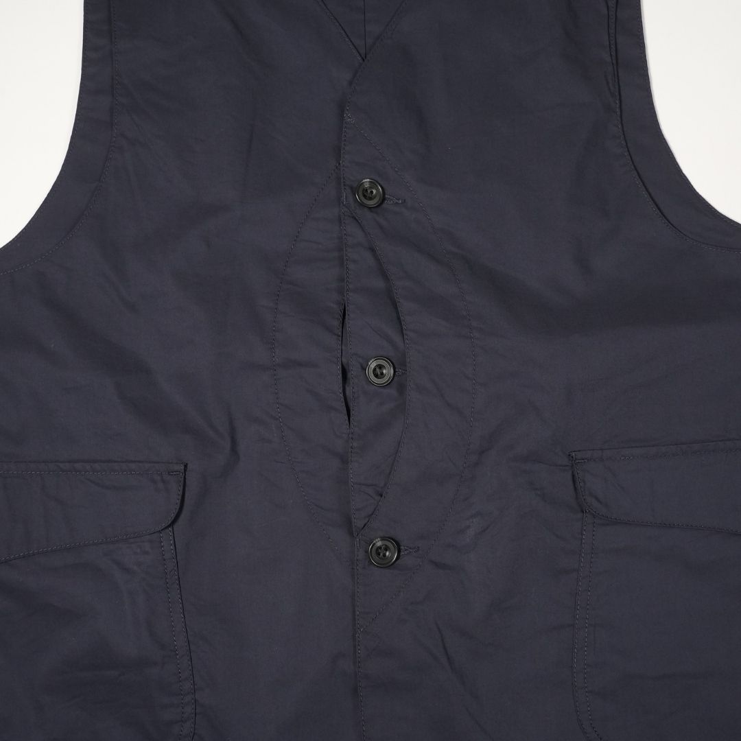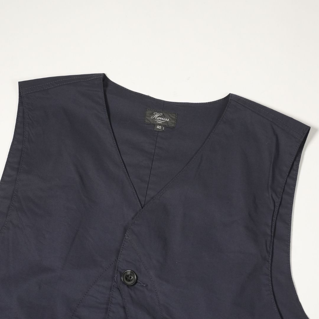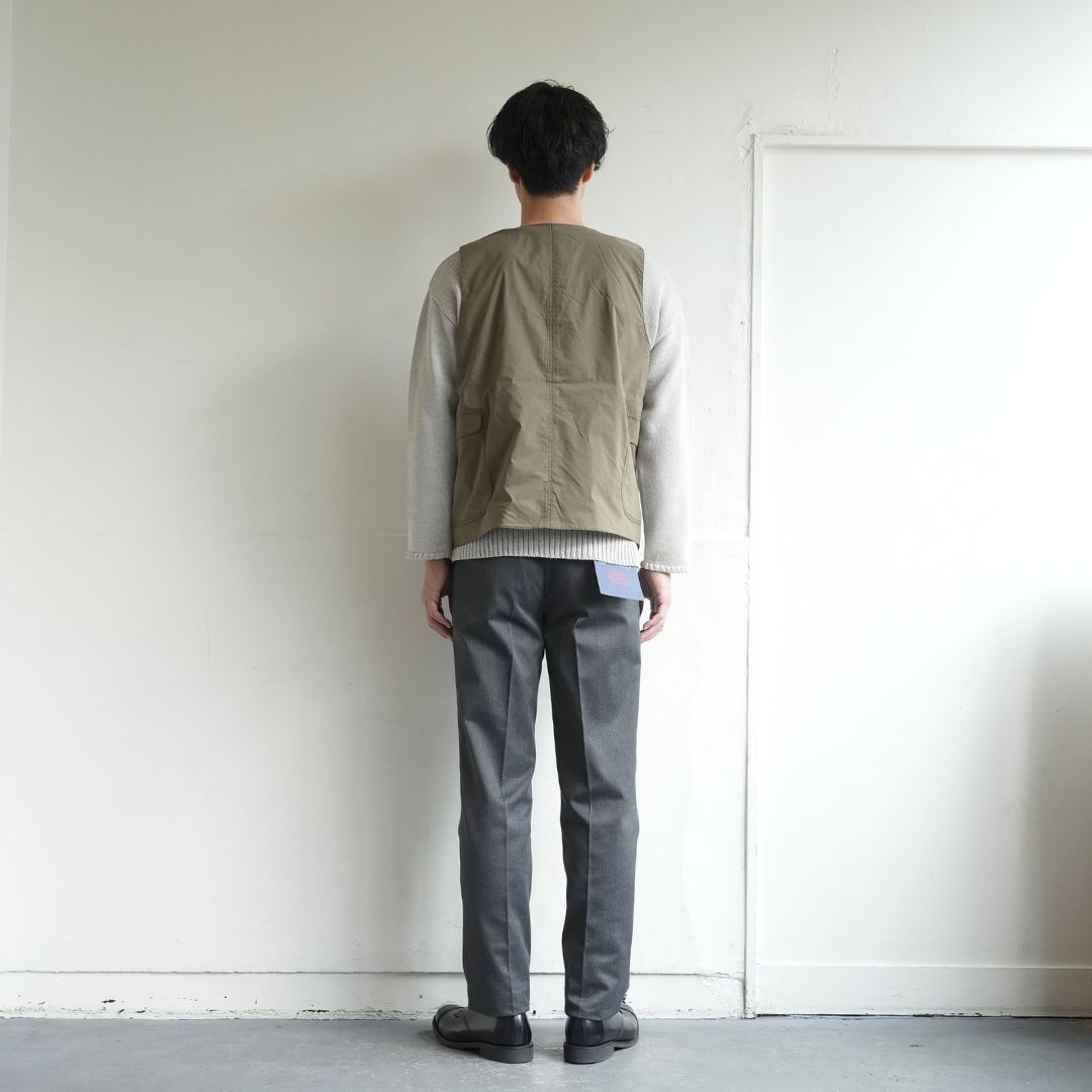 一方で、シルエットはしっかりとモダナイズされてあります。アームホールと身幅はややゆとりを持たせ、丈感は重ね着しやすいバランスに整えられています。シャツの上からはもちろん、薄手のニットにも無理なく重ねられる設計で、レイヤードの幅を広げてくれる存在です。古着のような野暮ったさはなく、あくまで普段のコーディネートで着られる仕上がりになっています。