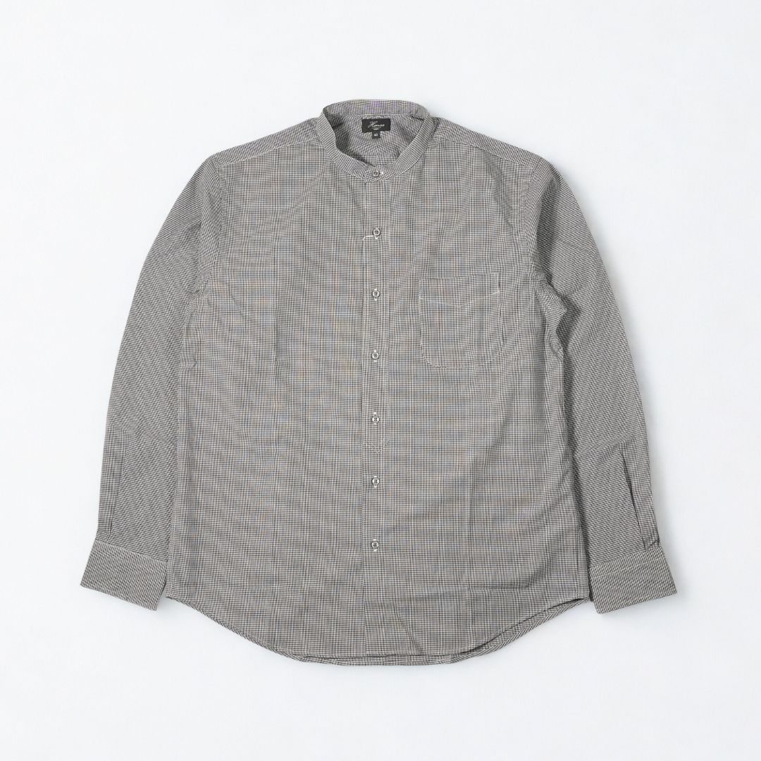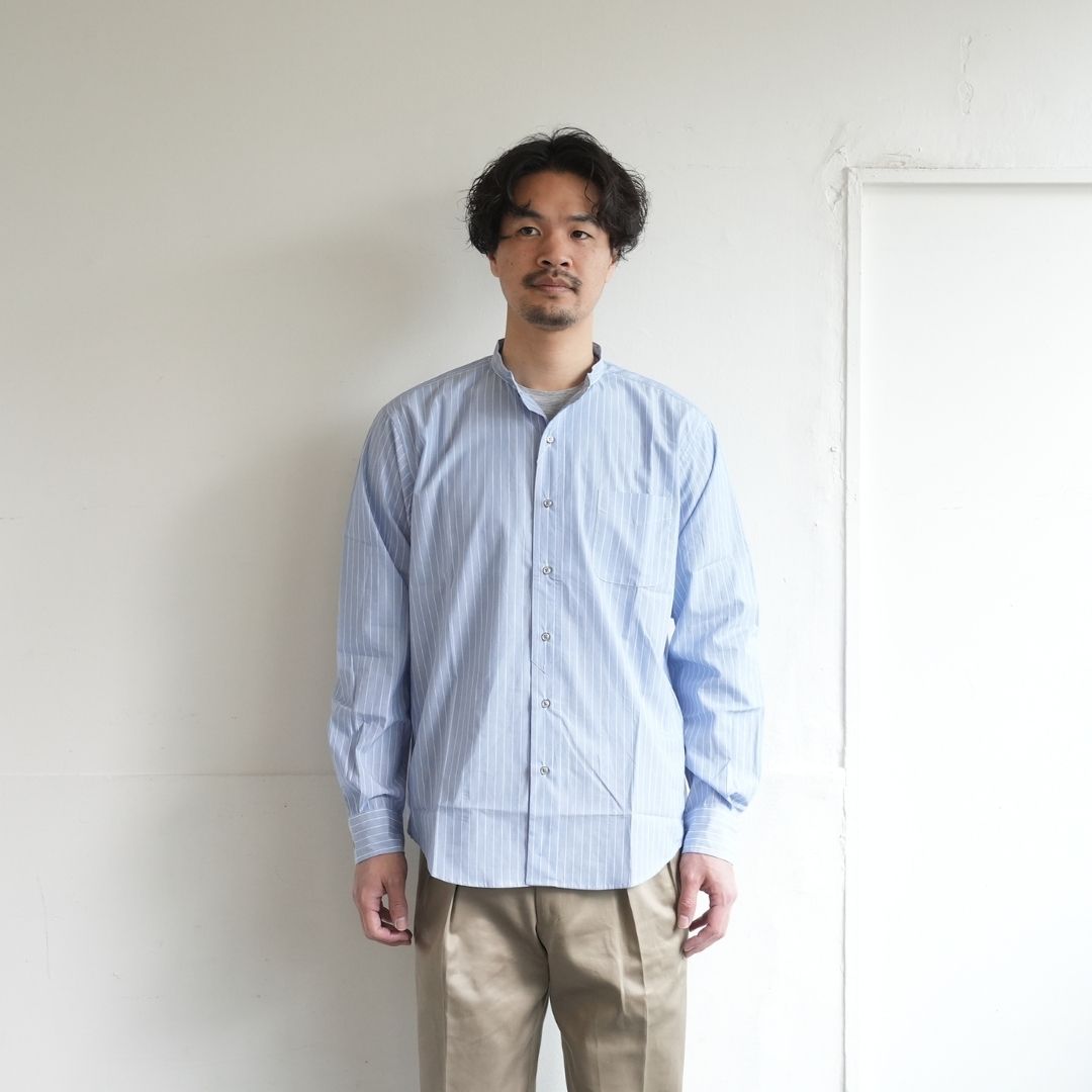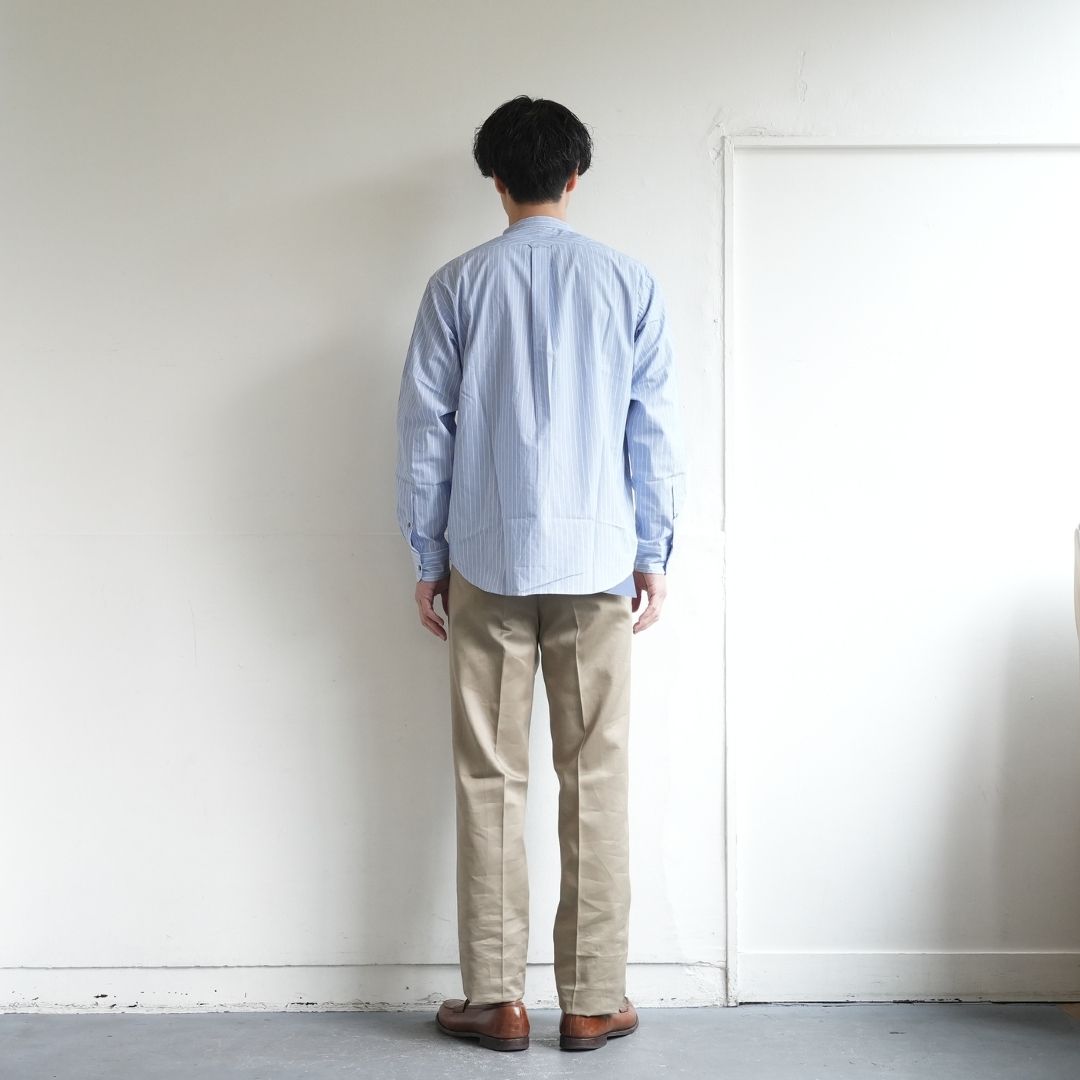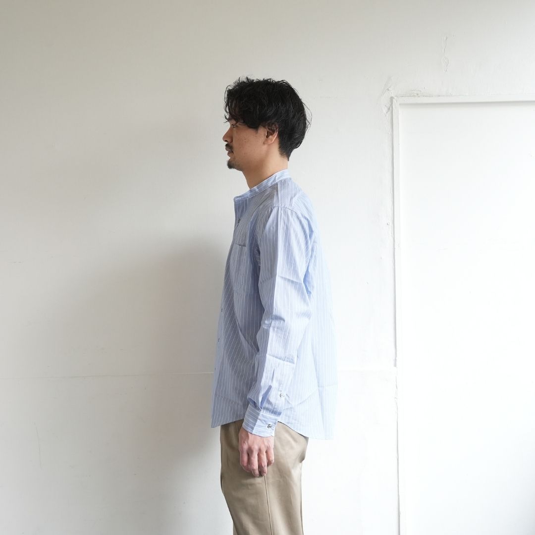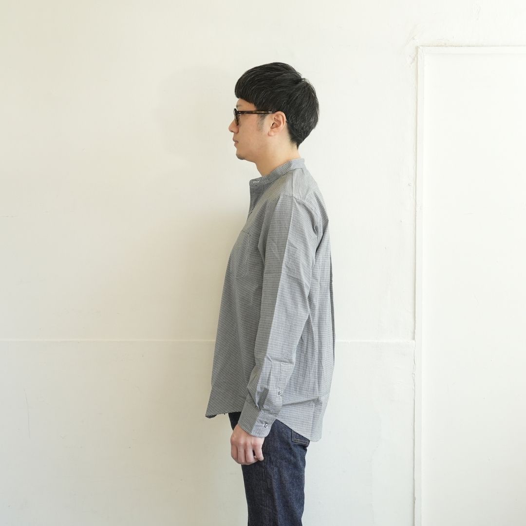 襟元はすっきりとしたバンドカラー仕様。レギュラーカラーに比べて柔らかい印象になり、ジャケットのインナーとしても収まりが良く、また一枚で着た際にも程よい抜け感を演出してくれます。