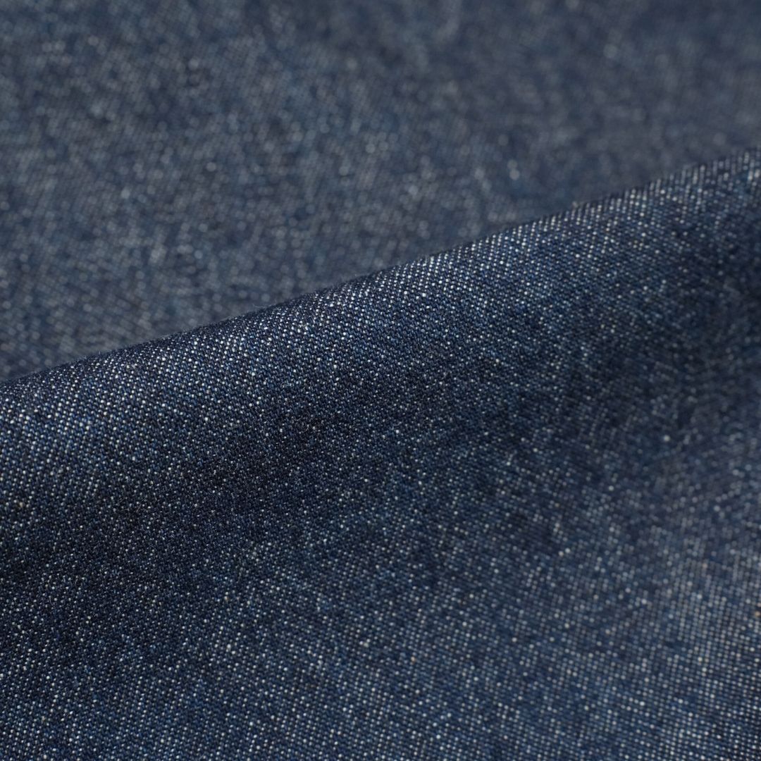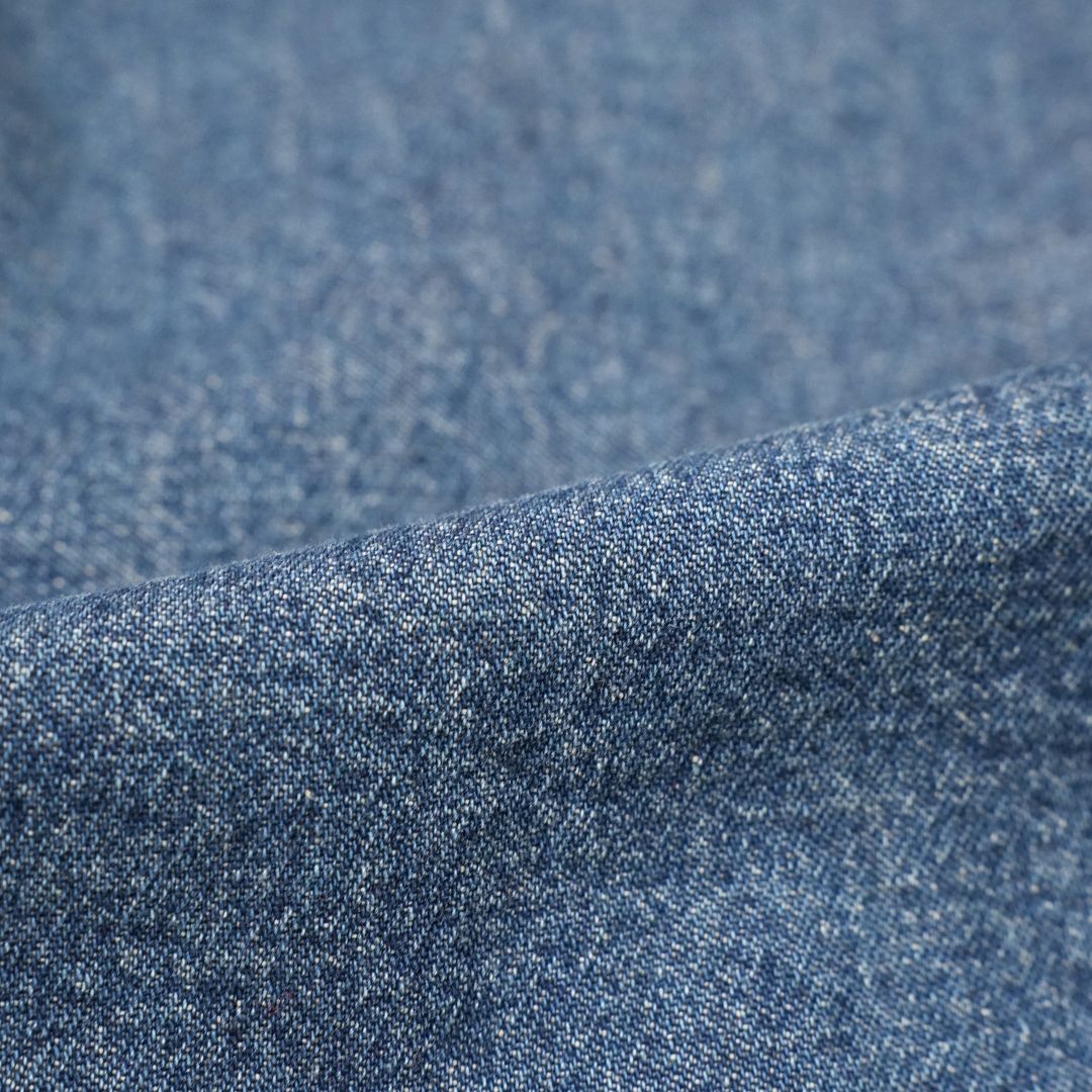 商品を平置きにして、股部分の合わせ(縫い目が十字に交差した部分)から裾までの長さをメジャーを生地に沿わせてはかっています。右足の股下をはかっています。