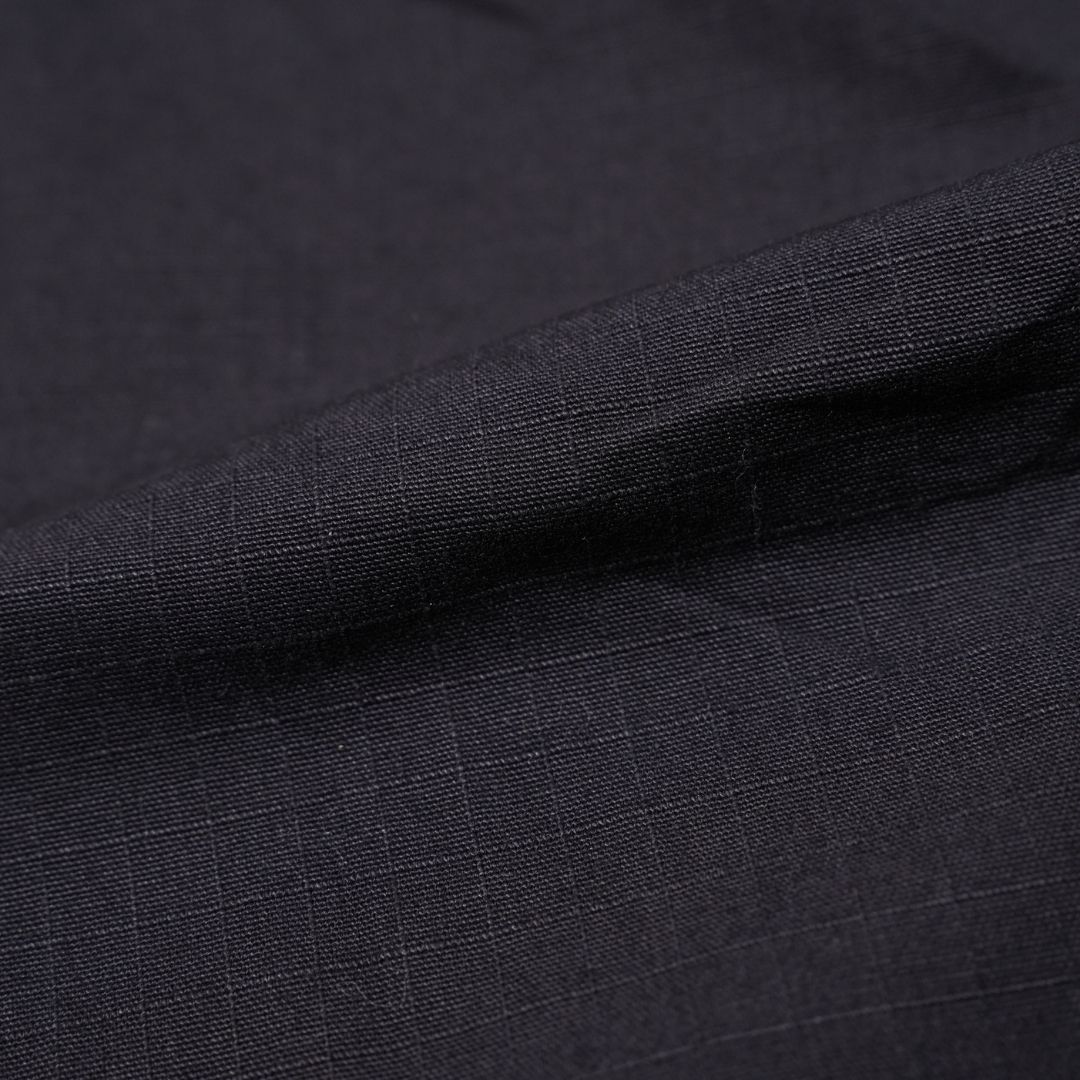 商品を平置きにして、股部分の合わせ(縫い目が十字に交差した部分)から裾までの長さをメジャーを生地に沿わせてはかっています。右足の股下をはかっています。
