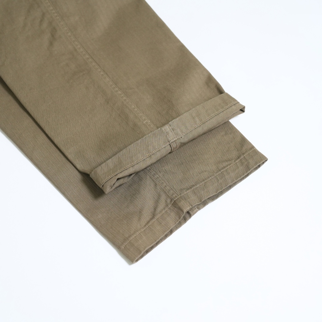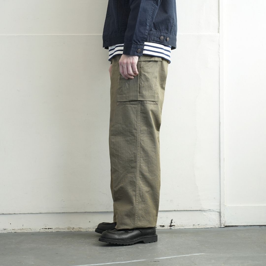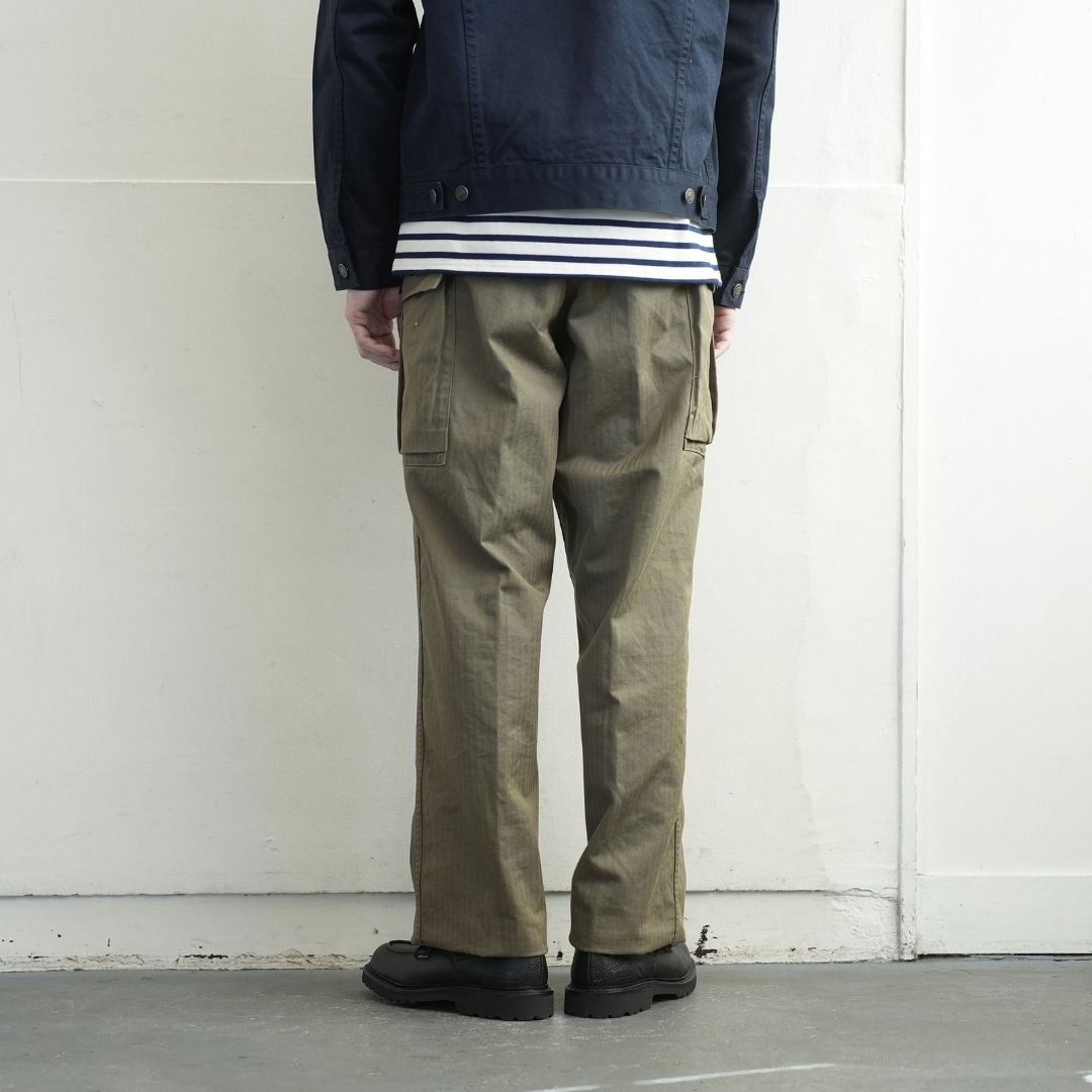 生地はカーキのヘリンボーン。少し黄みがかった色合いが特徴で、武骨な印象を持ちながらも実は合わせやすい色味です。年間を通して着用可能な程よい厚みで、見た目ほど重さはありません。穿き込むことで風合いが増し、ミリタリーパンツならではの経年変化も楽しめます。