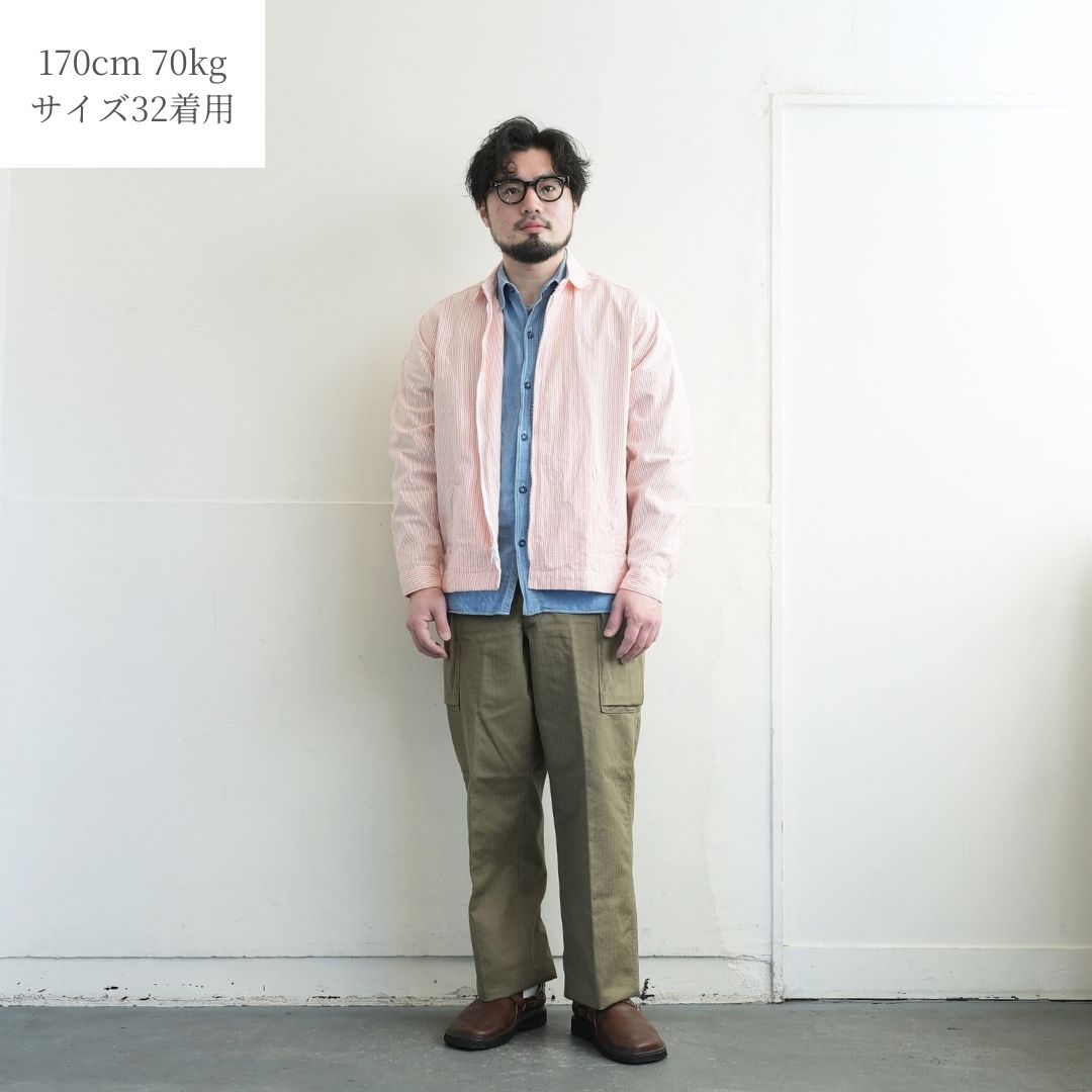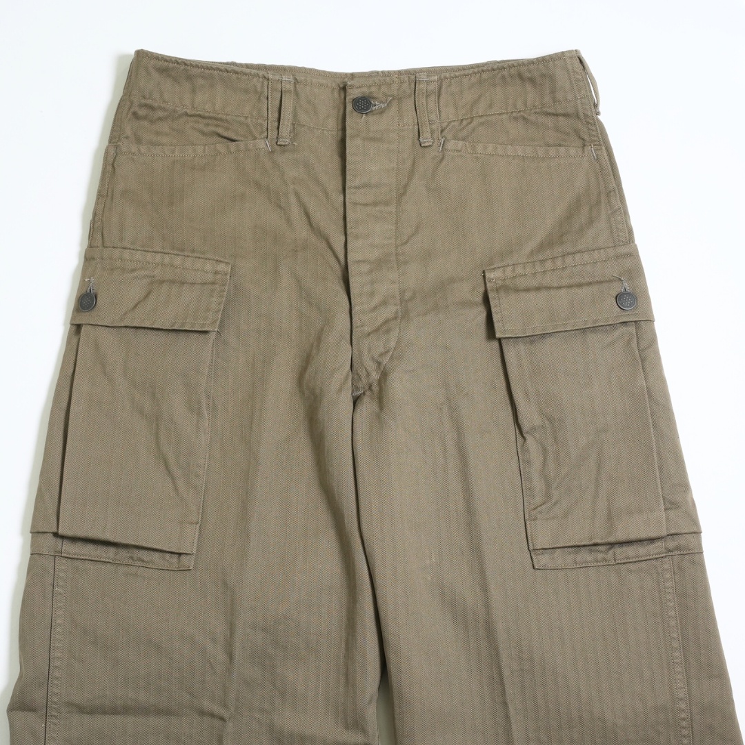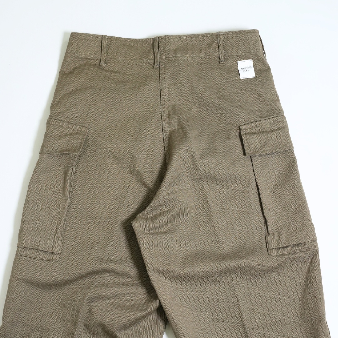 生地はカーキのヘリンボーン。少し黄みがかった色合いが特徴で、武骨な印象を持ちながらも実は合わせやすい色味です。年間を通して着用可能な程よい厚みで、見た目ほど重さはありません。穿き込むことで風合いが増し、ミリタリーパンツならではの経年変化も楽しめます。