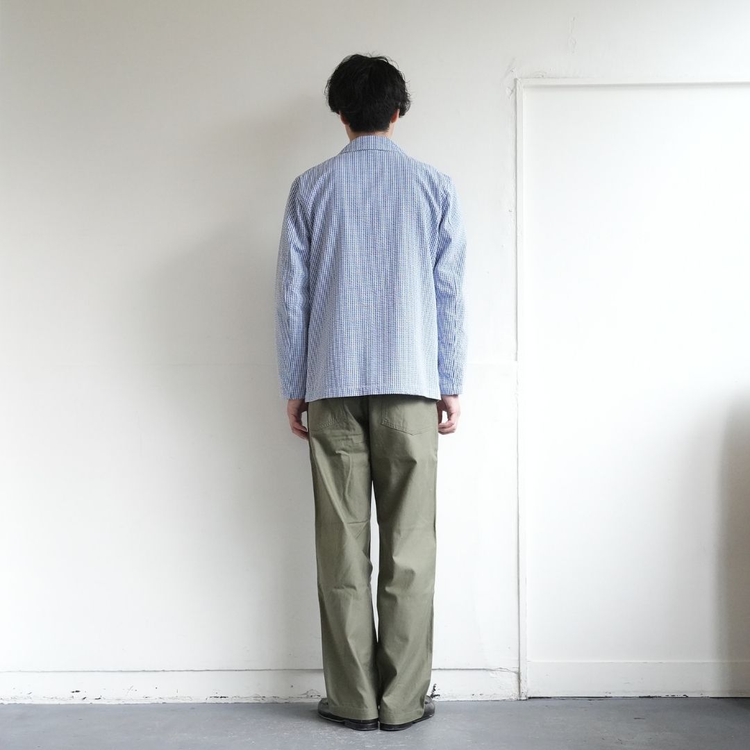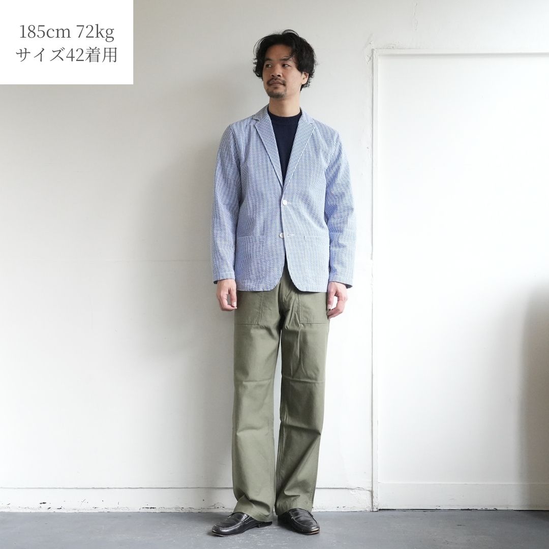 商品を平置きにして、ボタンを留めたパンツのウエスト幅をはかって、2倍にしています。