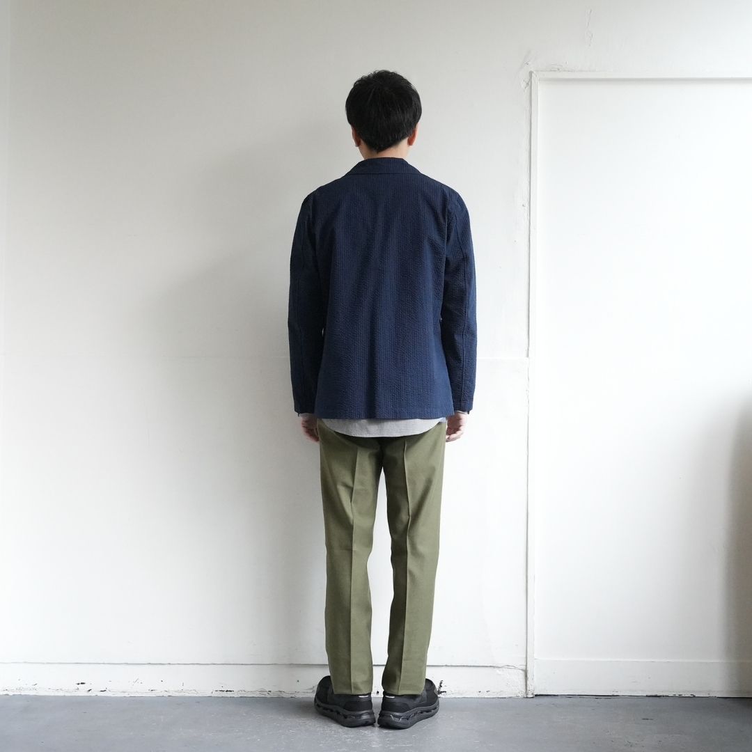 商品を平置きにして、股部分の合わせ(縫い目が十字に交差した部分)から裾までの長さをメジャーを生地に沿わせてはかっています。右足の股下をはかっています。