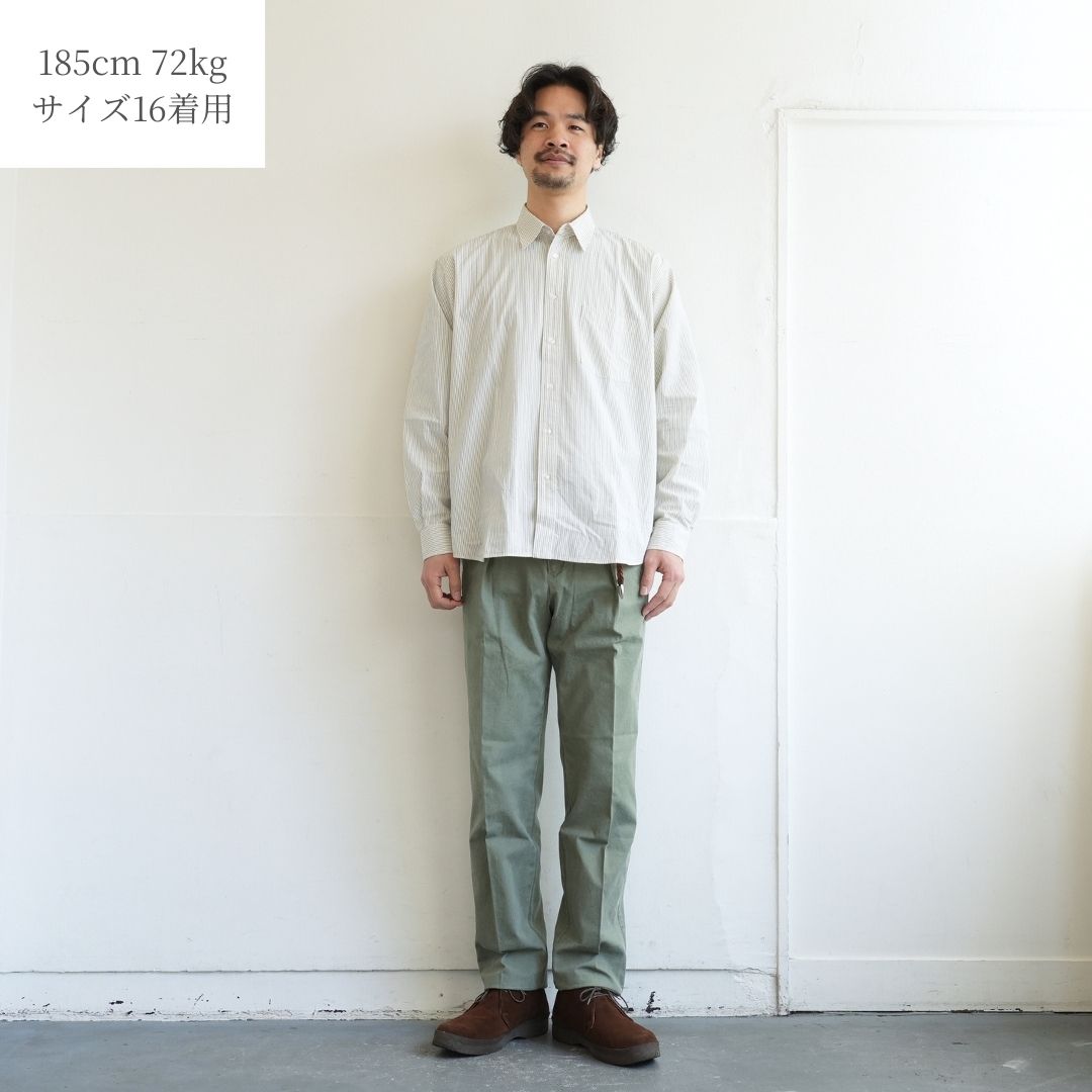 おおげさなビッグサイズなものでもないので、リゾルトをはじめとしたZABOU定番のパンツたちはもちろん、モダンなスラックスやイージーパンツなどにも合わせて欲しい一着です。