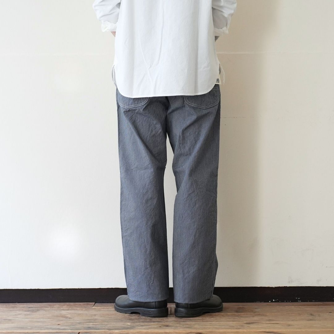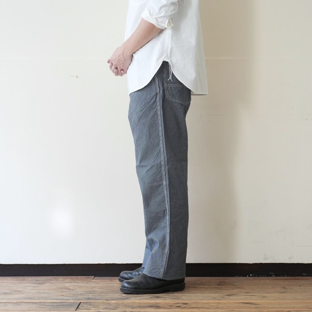 ワークウェアに通ずるタフな質感ですが、しなやかで軽く穿ける生地感です。柄も細かく街着に適したヒッコリーでとても良い素材だと思います。