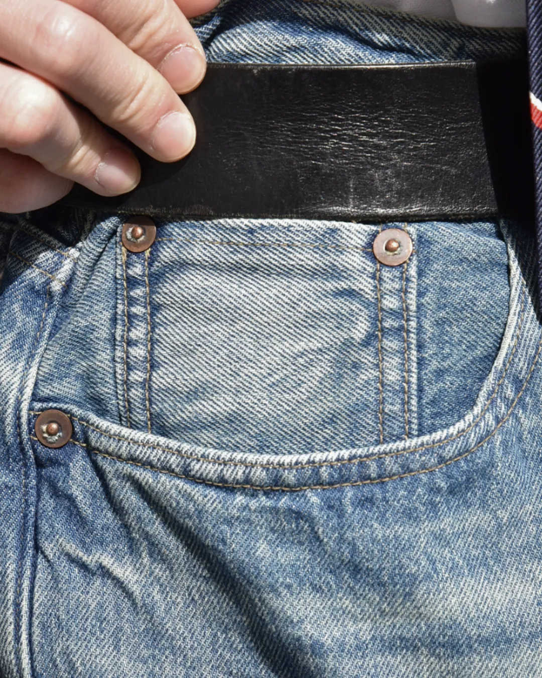 ベルトで腰位置を固定する。穿いた時のウエスト位置が変わると長さも変わってしまいます。ベルトで固定する事が大切です。
