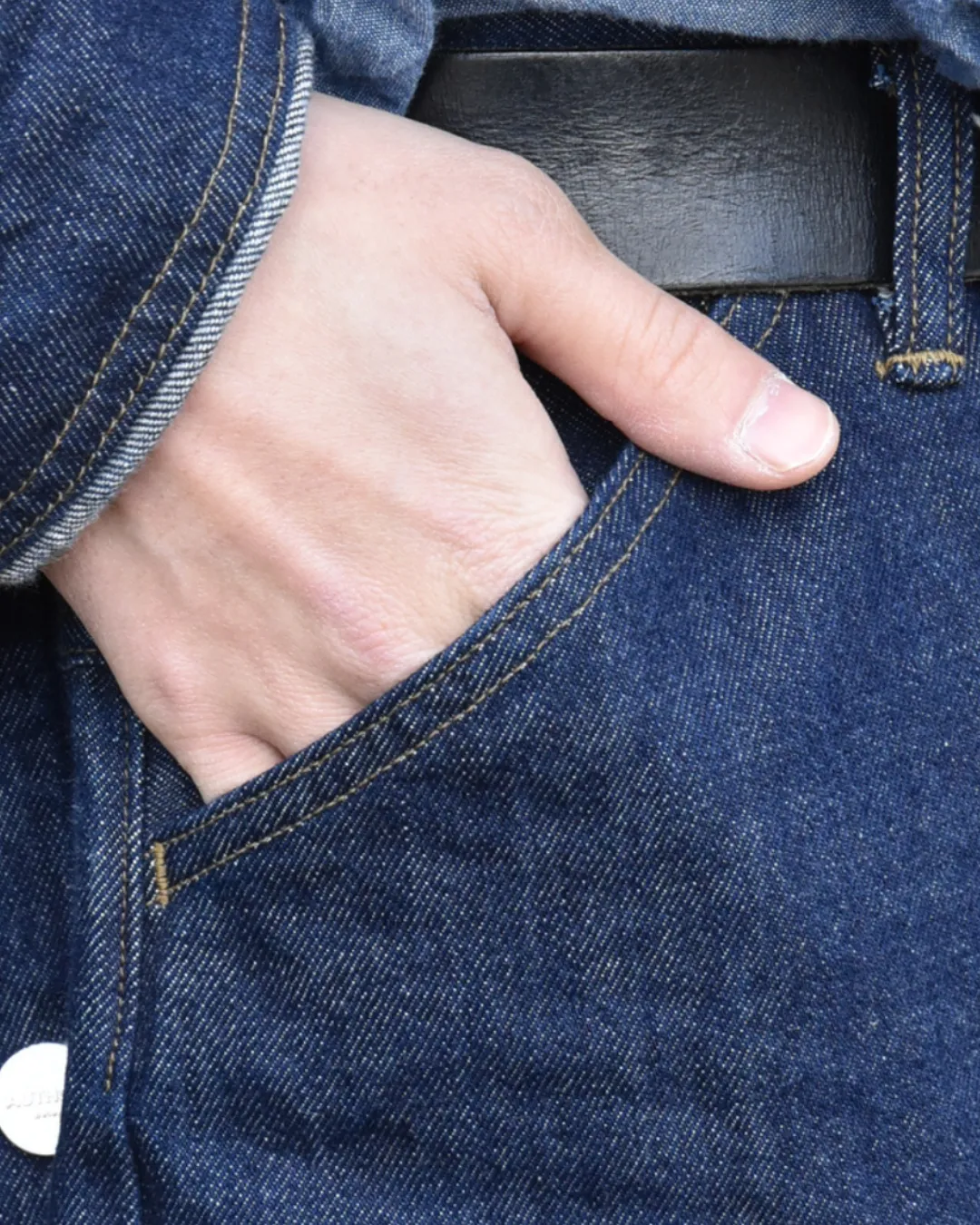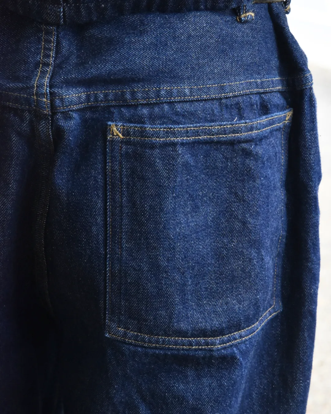 ベルトで腰位置を固定する。穿いた時のウエスト位置が変わると長さも変わってしまいます。ベルトで固定する事が大切です。