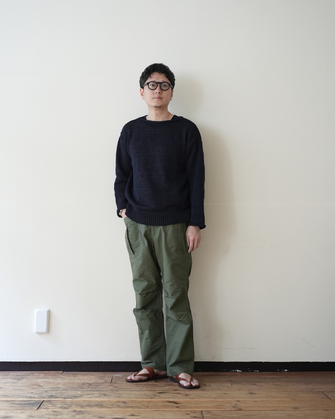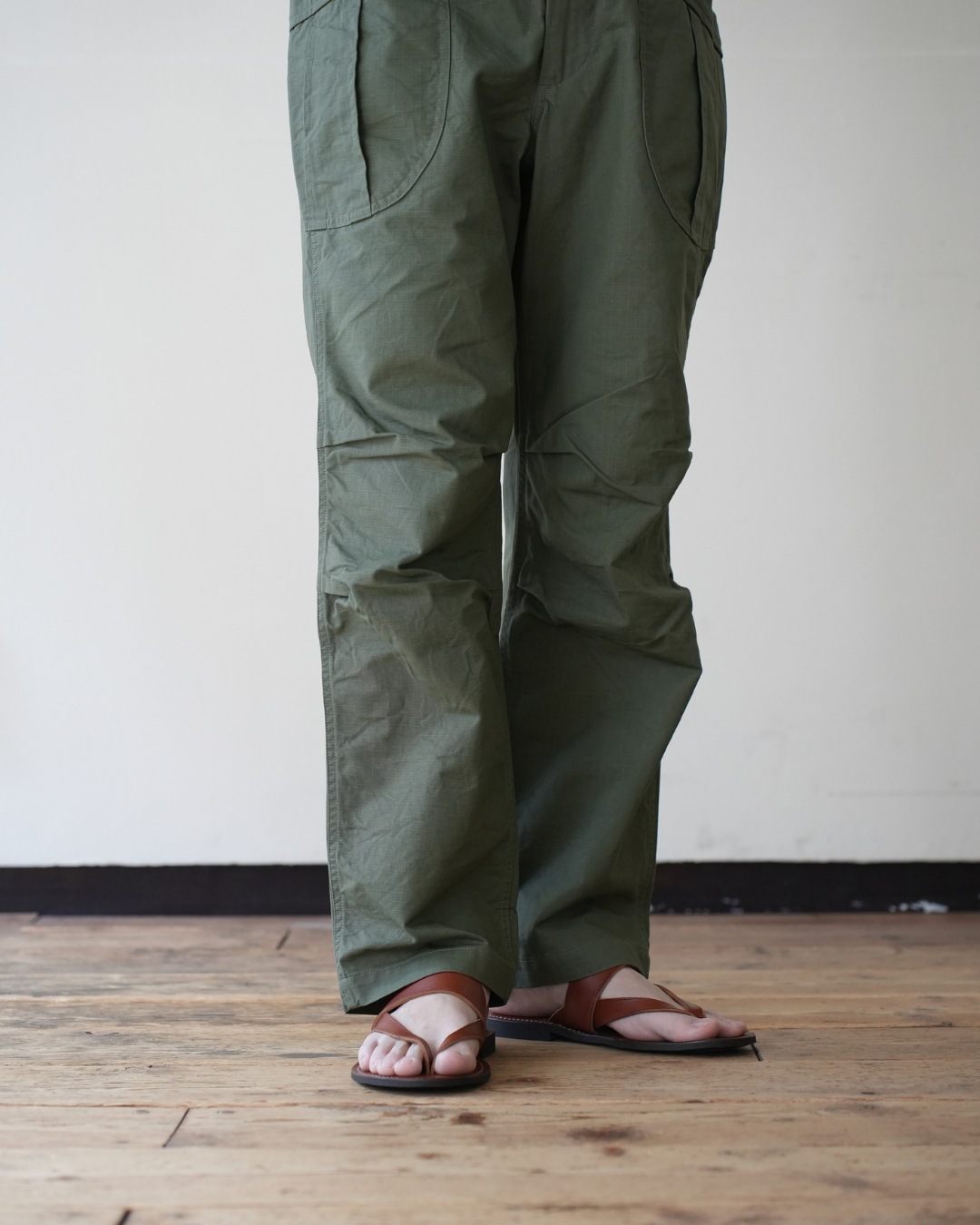 ベルトで腰位置を固定する。穿いた時のウエスト位置が変わると長さも変わってしまいます。ベルトで固定する事が大切です。
