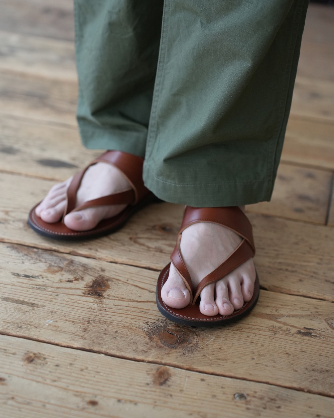 靴を履いて長さを決める。素足の状態で長さを合わせると靴を履いた時長さの見え方が異なります。合わせる靴を履いて長さを決めてください。